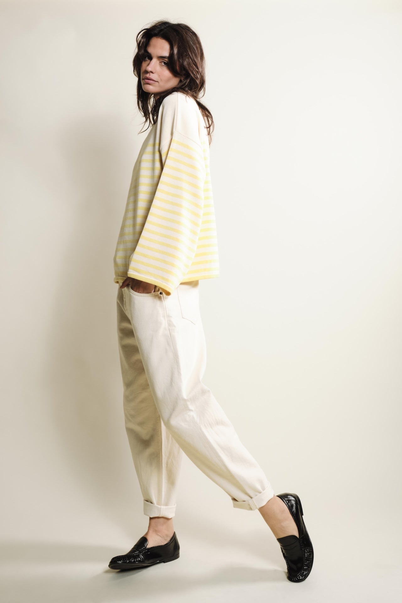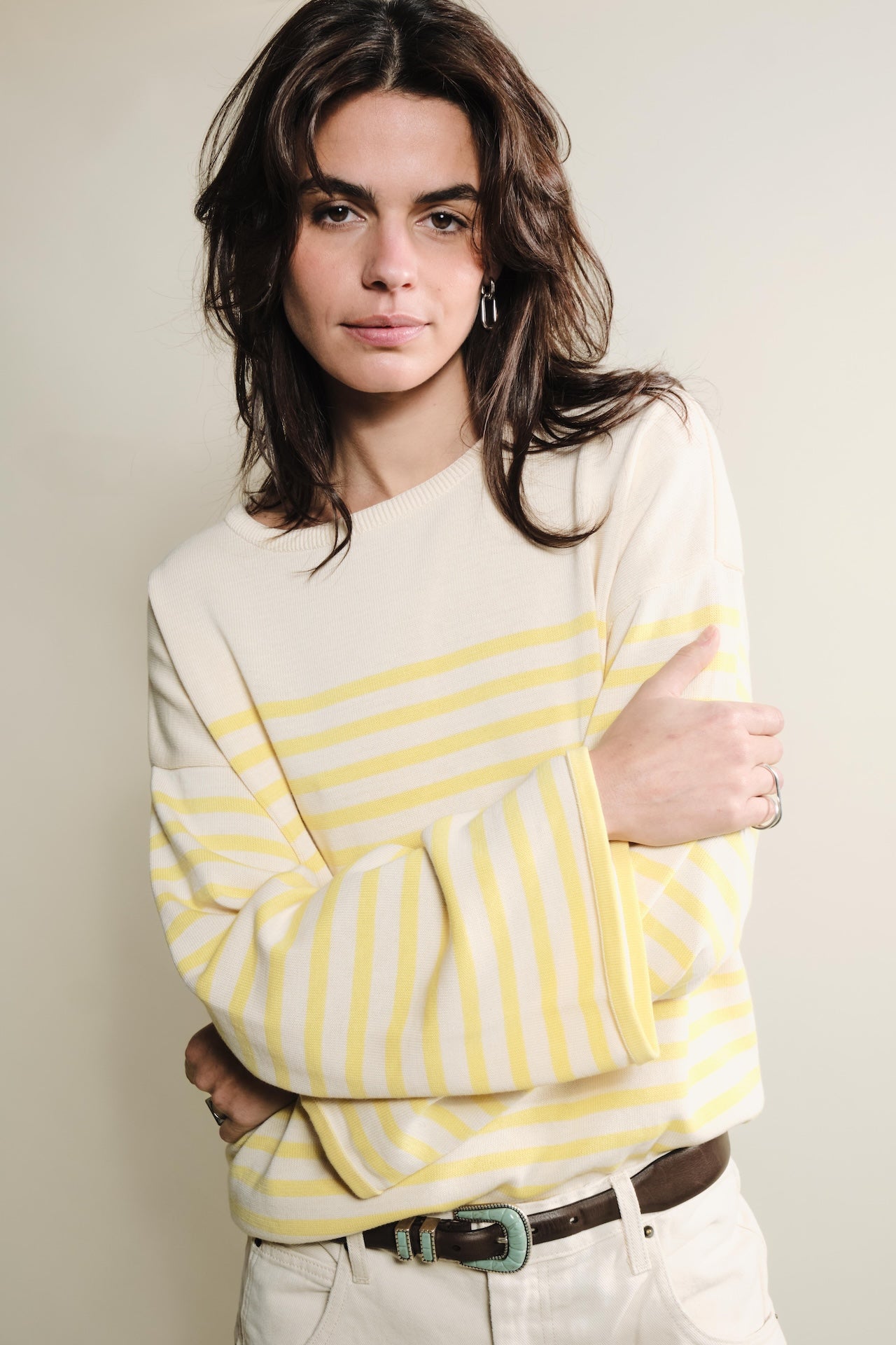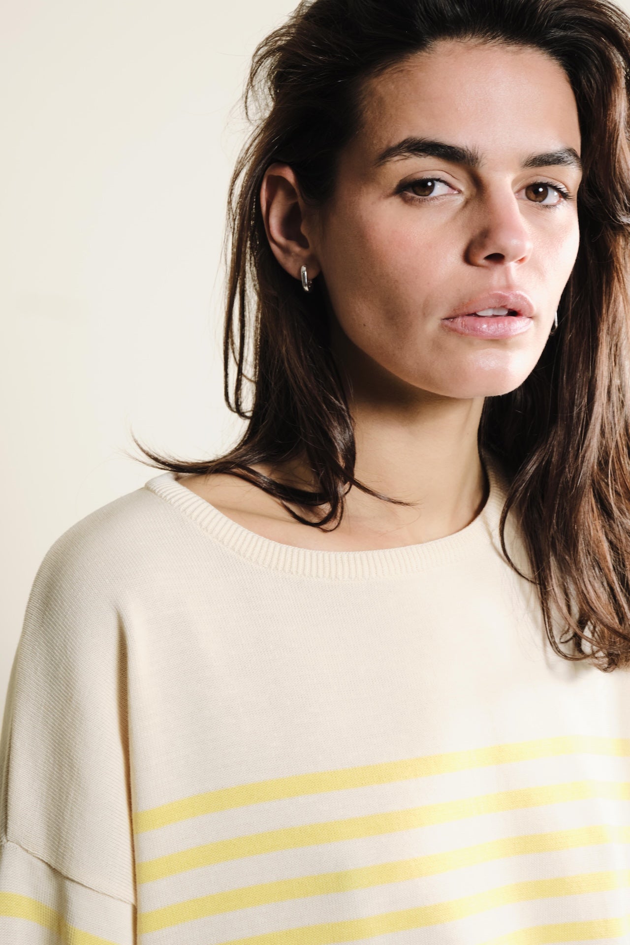 La maille Lori manches longues naturel / jaune allie confort et modernité grâce à sa coupe ample et ses épaules tombantes. Légère et respirante, elle est parfaite pour les looks de mi-saison ou les superpositions estivales. Le tricot en jersey met en valeur de fines rayures élégantes, tandis que le fil sec au toucher frais garantit confort et respirabilité sur la peau. Polyvalente, elle se porte seule ou en superposition pour un style casual chic ou structuré. Fabriquée en coton 100 % biologique certifié GOTS, OCS Blended et OEKO-TEX® Standard 100, cette maille naturel / jaune offre style, confort et durabilité. Matière : 100% coton biologique, labellisé OEKO-TEX standard 100 Tricotage : jersey Coupe : ample, épaules tombantes Finitions : poignets larges Toucher : sec et frais