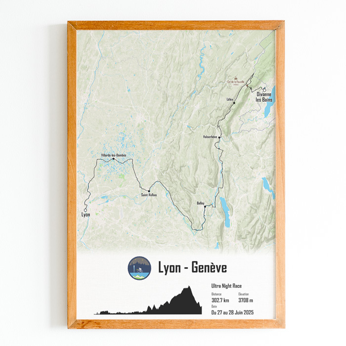 Cette affiche du parcours de la Lyon - Genève Ultra Night Race est imprimée sur du papier brillant haute qualité.Pour créer un poster personnel et unique, ajoutez votre numéro de dossard, votre nom, prénom, votre temps d'arrivée ou le texte que vous souhaitez.