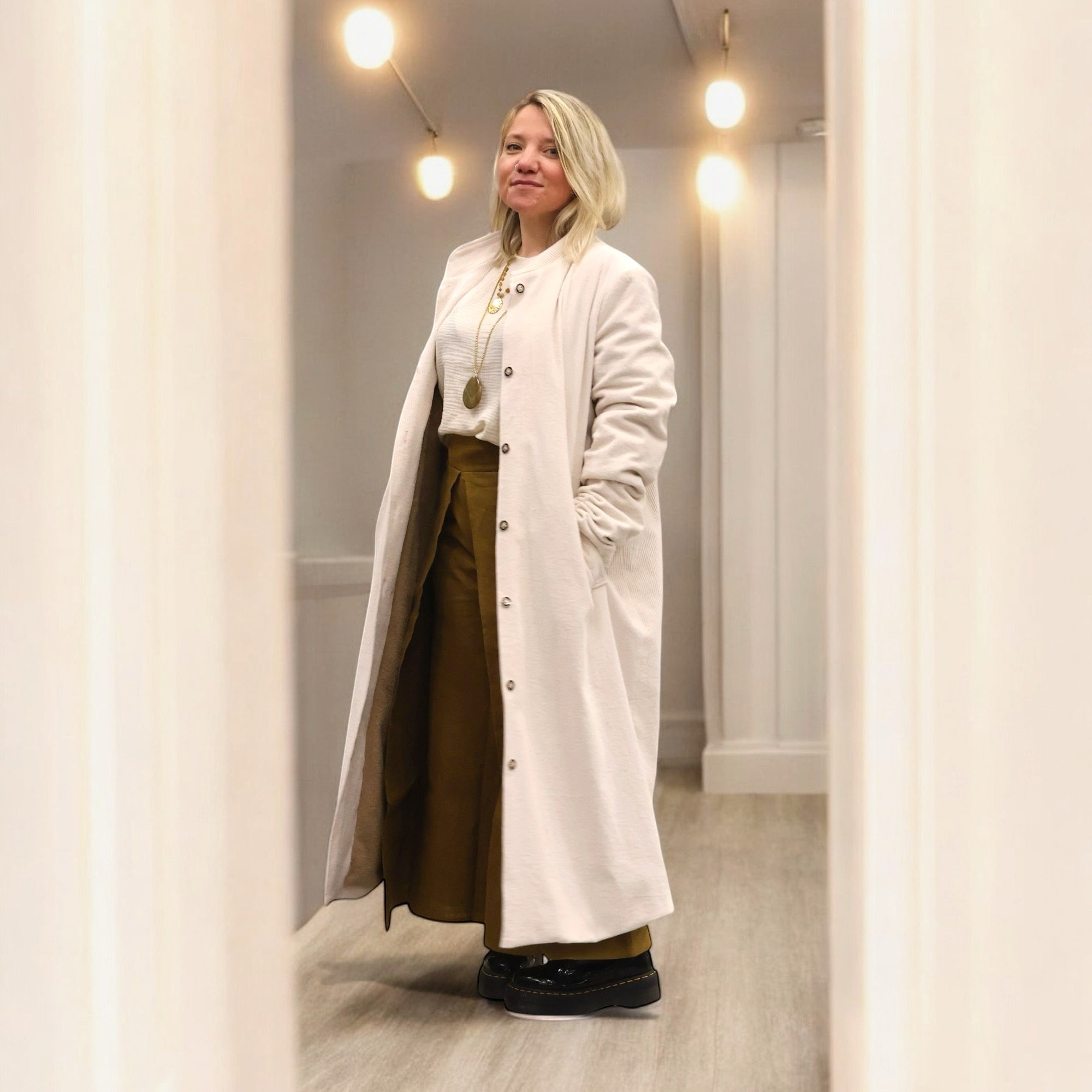Paul est un manteau à la coupe droite, long, avec un col mao montant, des poches latérales à revers et une élégante fente au dos. Les manches longues sont conçues pour dévoiler la belle doublure, agrémentée de boutons français en émail, ornés de perforations en forme de fleurs.