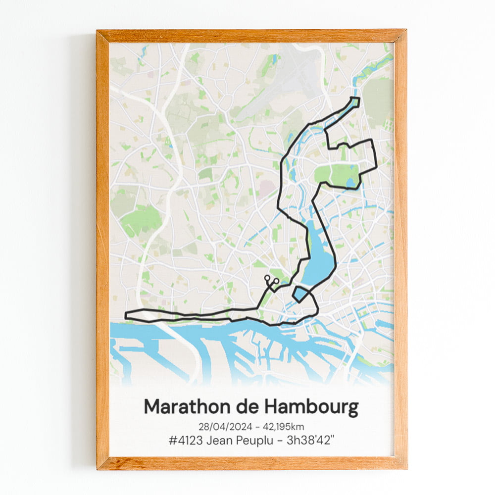Votre affiche souvenir du Marathon de HambourgCette impression design du parcours est entièrement personnalisable pour refléter votre propre exploit. Disponible en plusieurs tailles et avec différentes options de couleurs pour le fond de carte et la trace, elle s'adapte parfaitement à votre décoration intérieure.