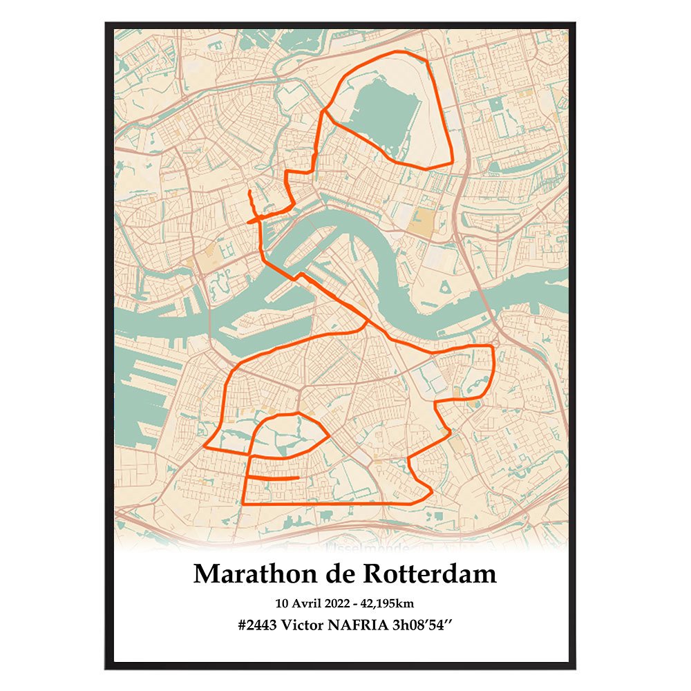 Cette affiche du parcours du marathon de Rotterdam est imprimée sur du papier photo brillant haute qualité.Pour créer un poster personnel et unique, ajoutez votre numéro de dossard, votre nom, prénom, votre temps d'arrivée ou le texte que vous souhaitez.