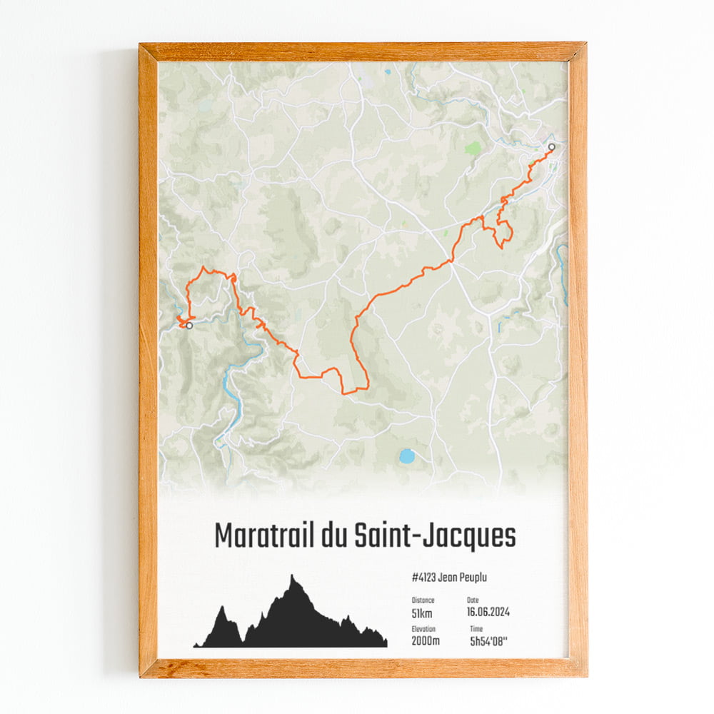 Cette affiche du parcours du Maratrail du Saint-Jacques est imprimée sur du papier photo brillant haute qualité.Pour créer un poster personnel et unique, ajoutez votre numéro de dossard, votre nom, prénom, votre temps d'arrivée ou le texte que vous souhaitez.