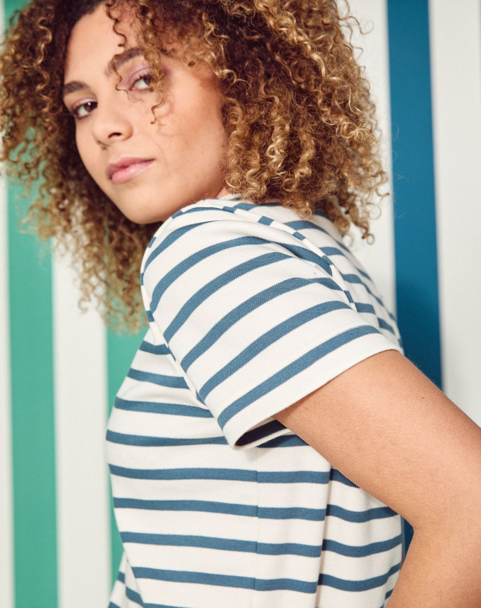 Marinière - Rayure Bleu pétrole / Ecru - Col V - Blanc - Femme | Yuna, la marinière qui mêle douceur et caractère. Une coupe pensée pour accompagner les mouvements, sans jamais entraver le style.