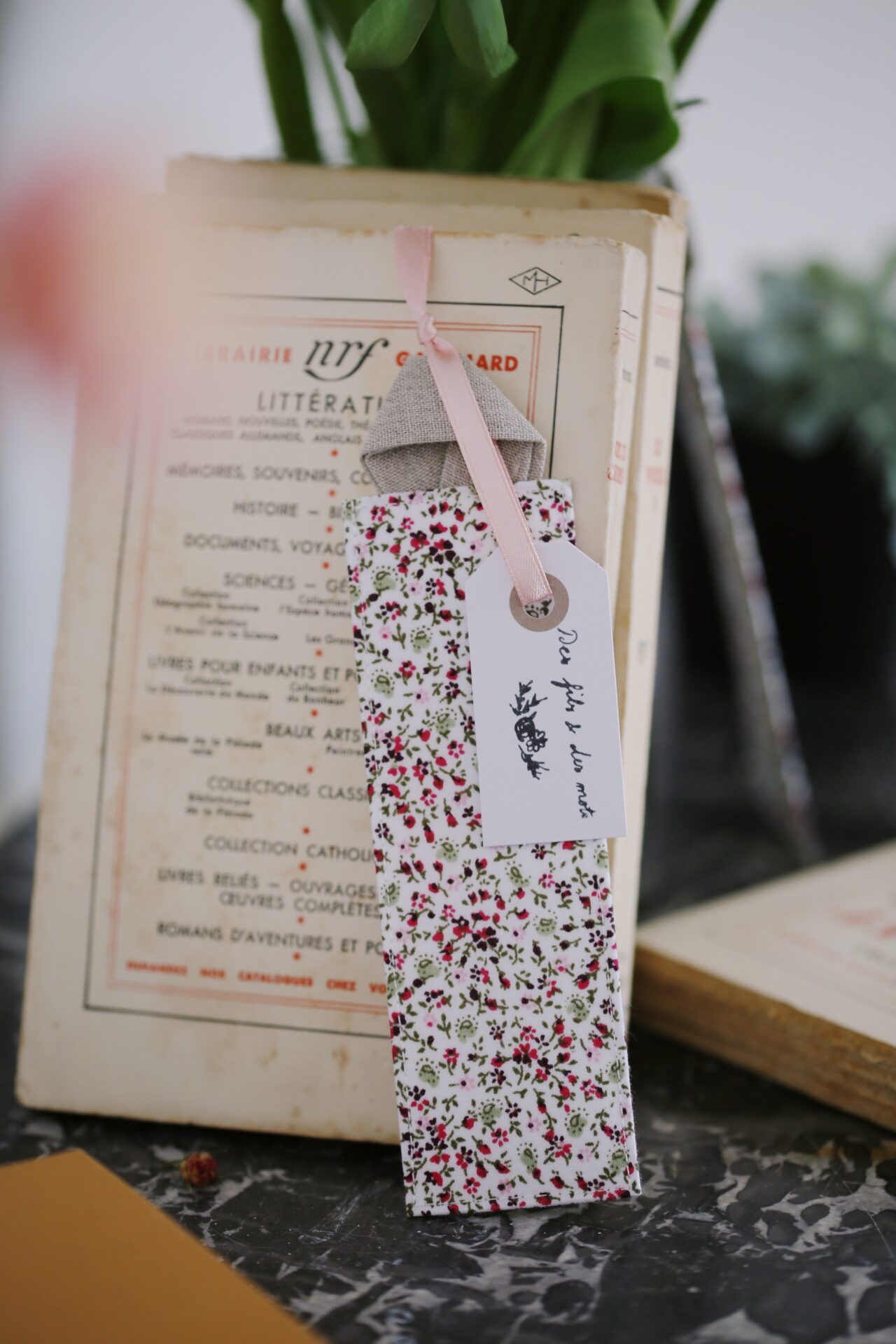 La confection du marque-page et l’empiècement avec du lin tissé en France ont été entièrement réalisés à la main.Marque-page réalisé avec du tissu en coton certifié oeko-tex.