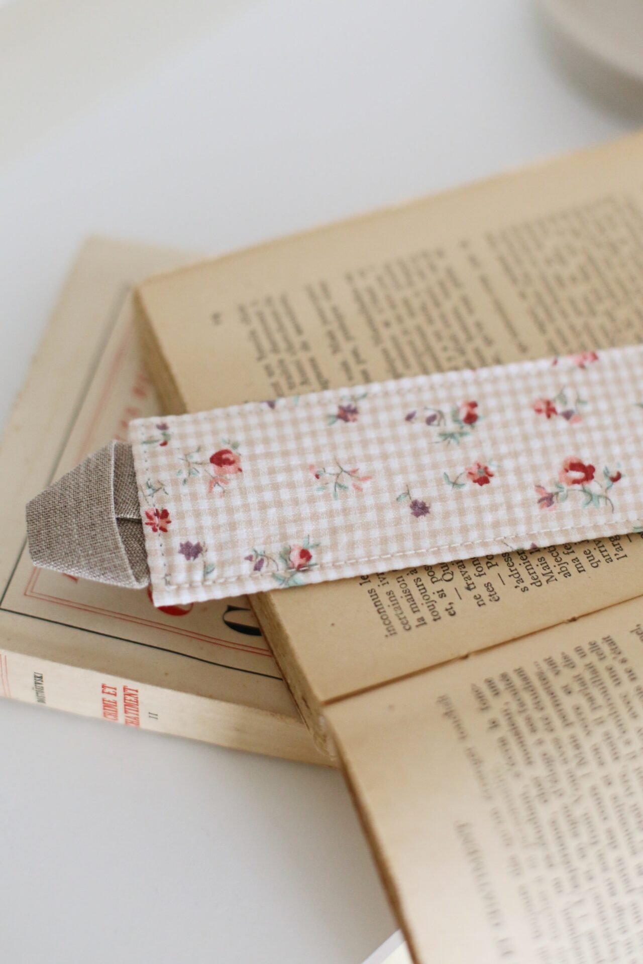 La confection du marque-page et l’empiècement avec du lin tissé en France ont été entièrement réalisés à la main.Marque-page réalisé avec du tissu en coton certifié oeko-tex.