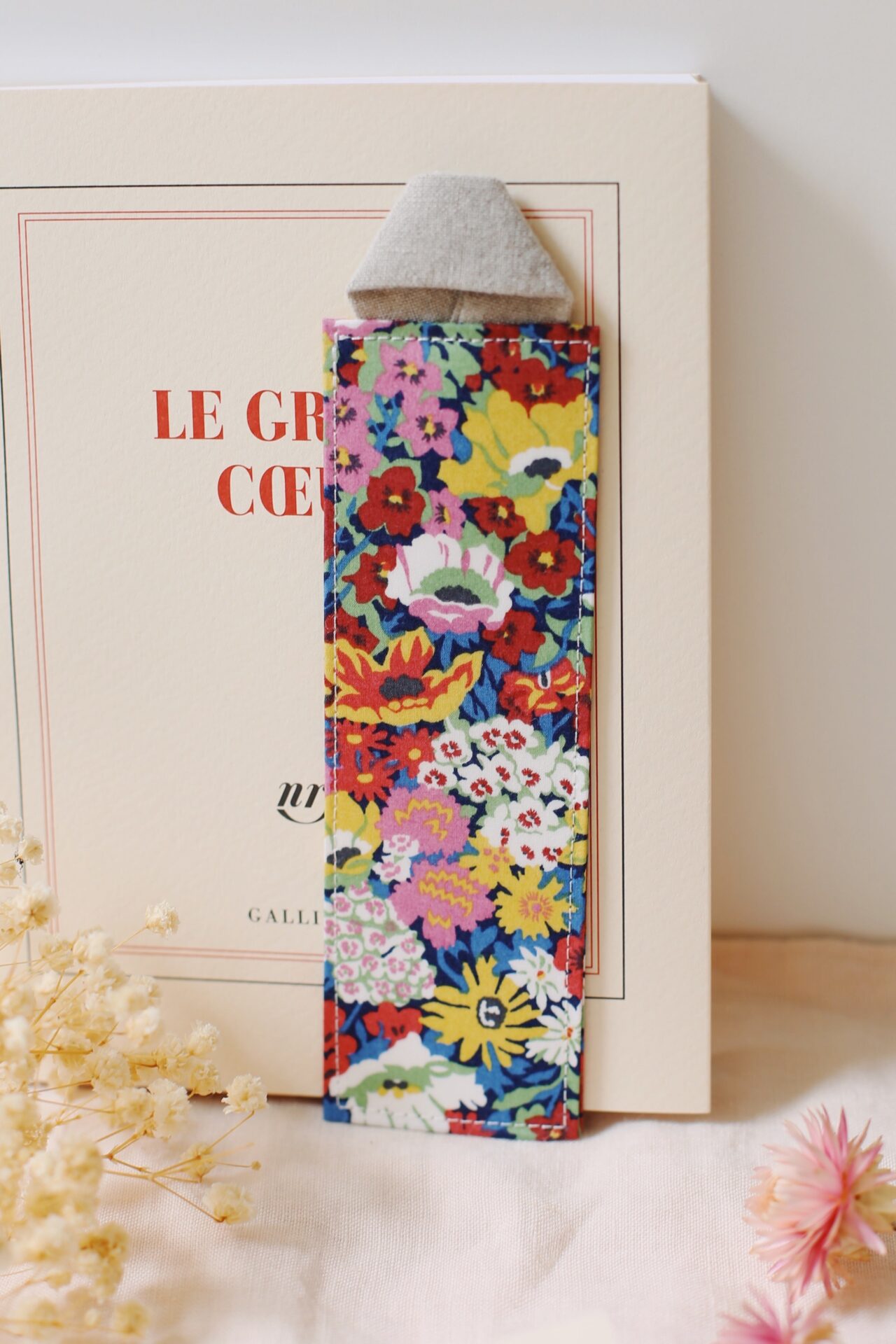 La confection du marque-page et l’empiècement avec du lin tissé en France ont été entièrement réalisés à la main.Marque-page réalisé avec du tissu Liberty London en coton certifié oeko-tex et fabriqué en Europe.