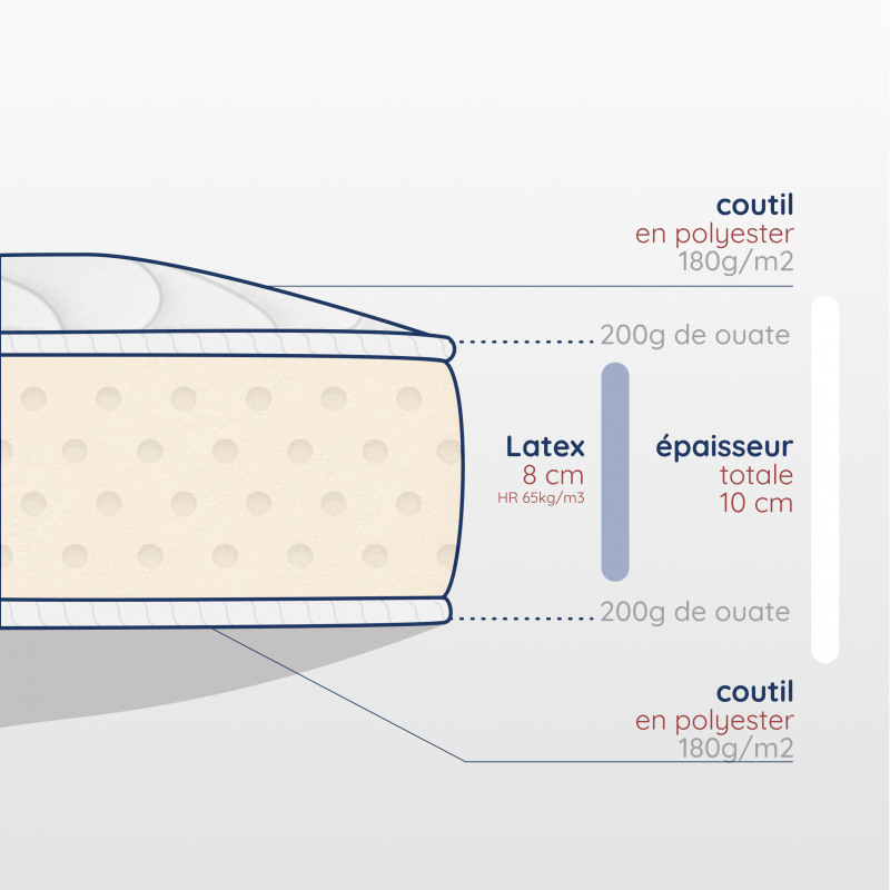 Matelas latex 50x90cm fabriqué en France. Ce matelas bébé en latex semi-naturel est idéalement adapté à la morphologie de votre enfant.