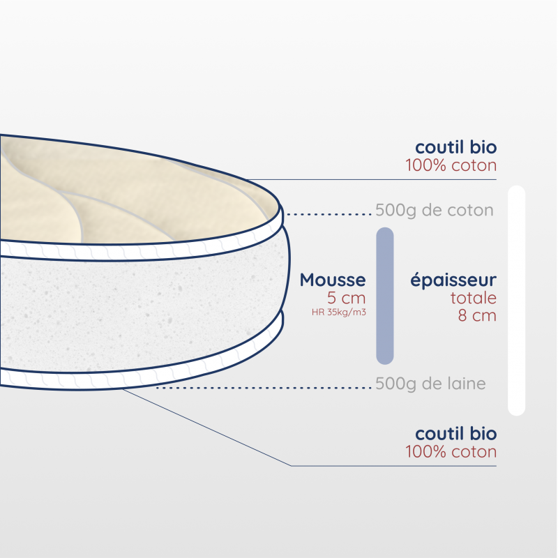 Découvrez le matelas pour couffin ovale face été/hiver confort médium pour bébé ! Grâce à son garnissage en mousse haute résilience 35kg/m3, ce matelas pour bébé est parfaitement adapté aux besoins et à la croissance de votre enfant. Comme son nom l'indique, ce matelas comprend deux faces : Une face été en coton issu de l'agriculture biologique 500g ; Une face hiver en laine thermo naturelle 500g.