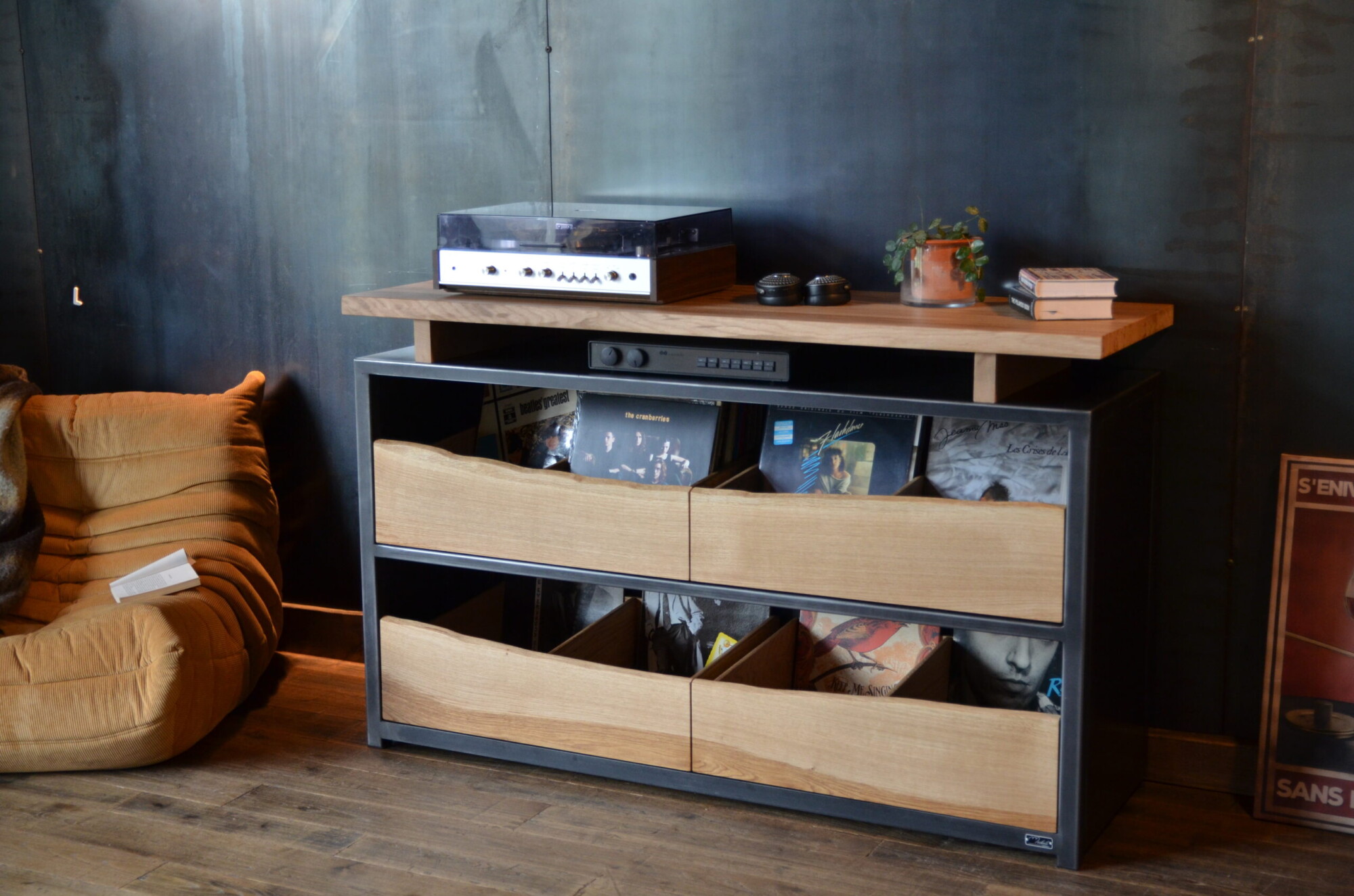 Le rituel du disquaire s'invite dans votre salon. Le meuble THALIA redéfinit l'expérience audiophile avec ses 4 tiroirs à consultation frontale (système digging) pouvant abriter près de 500 vinyles. Sa signature unique ? Des façades en chêne massif "Live Edge" qui conservent les courbes naturelles de l'arbre. Conçu pour neutraliser les vibrations grâce à un plateau de 40 mm et un châssis en acier soudé, ce meuble artisanal fabriqué en Mayenne offre une stabilité acoustique absolue à votre platine.