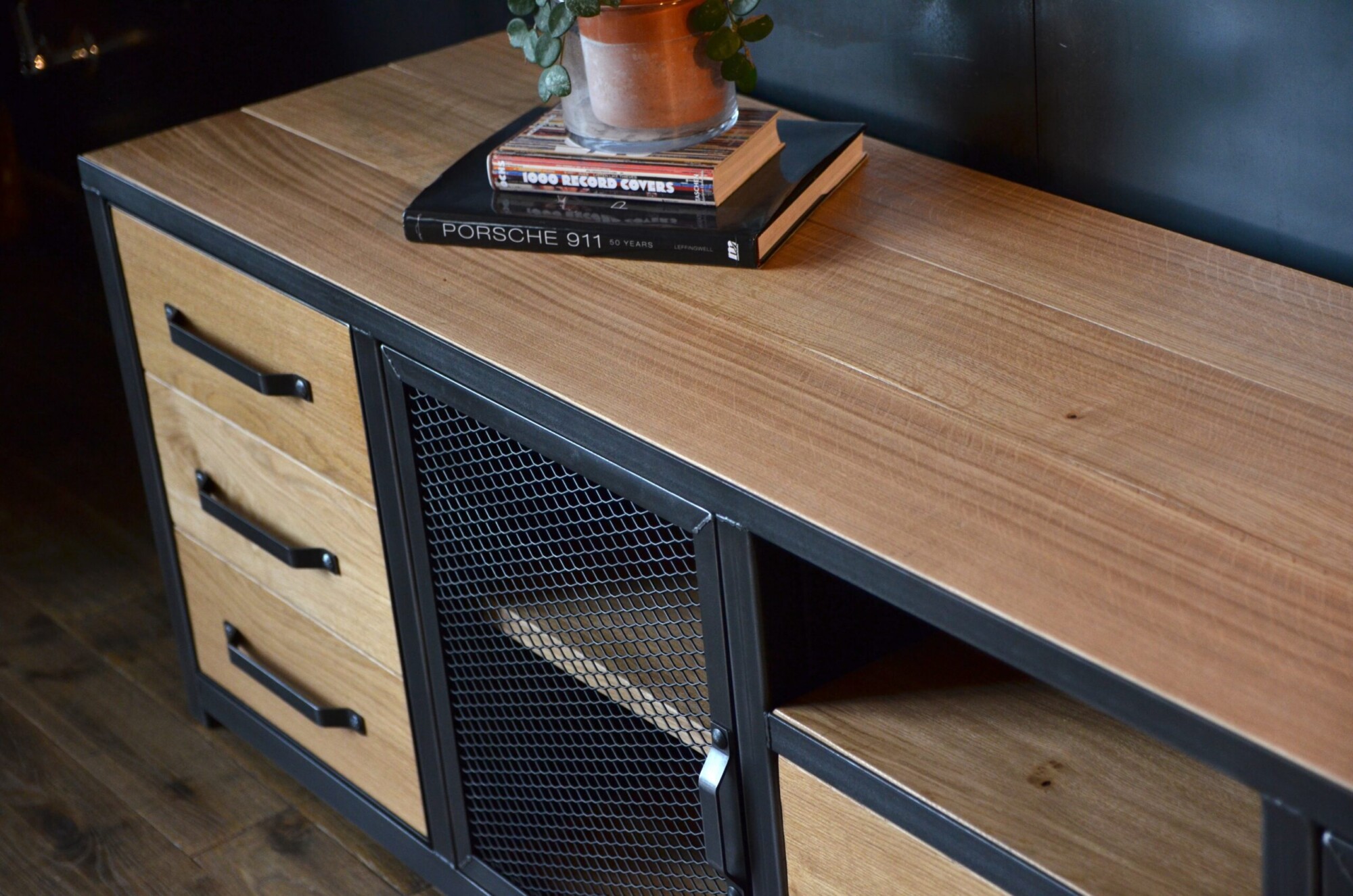 Une présence brute pour les grands espaces. Le meuble ULYSSE (240 cm) impose son caractère avec un design asymétrique mêlant chêne massif français et acier de forte épaisseur. Ses façades ingénieuses combinent "faux tiroirs" esprit manufacture et portes grillagées permettant le passage des signaux infrarouges et une ventilation optimale de vos amplis. Forgé à la main en Mayenne, ce buffet TV garantit une horizontalité parfaite à vie, même sous le poids des écrans géants les plus massifs.