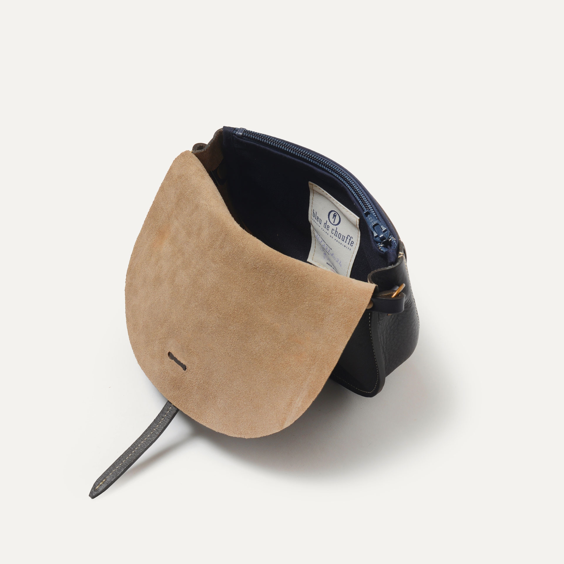Mini sac à main cuir femme Java marron brun, Bleu de Chauffe. Format compact, léger, cuir tanné végétal, bandoulière réglable. Fabrication artisanale Made in France.