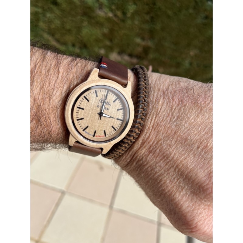 Boîtier bois d'érable : Ø 40 mm (mixte) - Cadran finition bois clair - Aiguilles fluorescentes Montre fournie dans son écrin luxe spécifique Bracelet 18 mm en croute de cuir vachette marron cocarde Bleu-Blanc-Rouge Mouvement Citizen 2035 / Seiko PC21 Montre fabriquée en France à Besançon. Étanchéité : 3/ATM-Éclaboussures