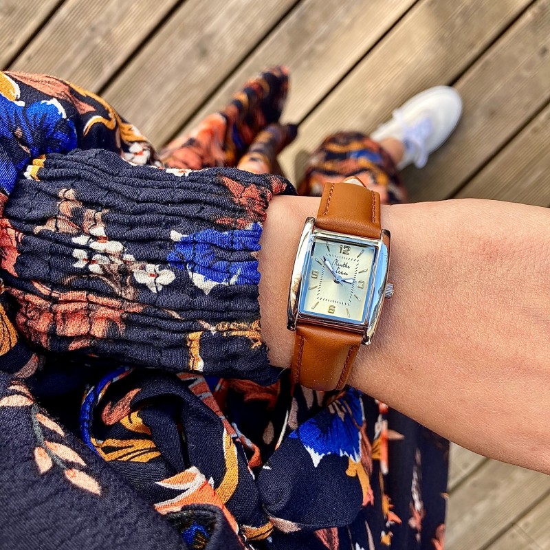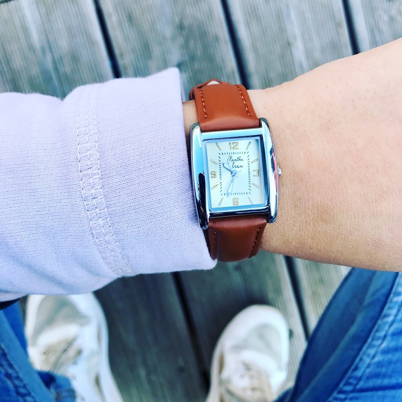 Montre Femme La Rectangle bracelet cuir camel fond champagne