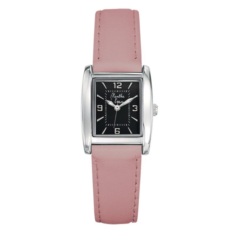 Montre Femme La Rectangle bracelet cuir Rose Pastel fond noir