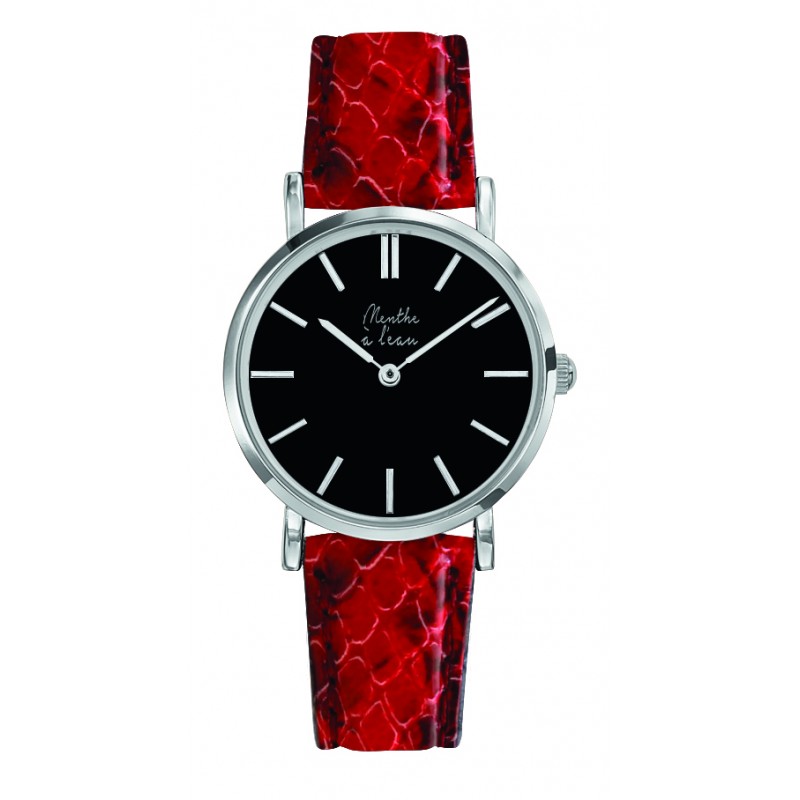 Montre Femme La Véritable bracelet cuir python rouge fond noir chromée