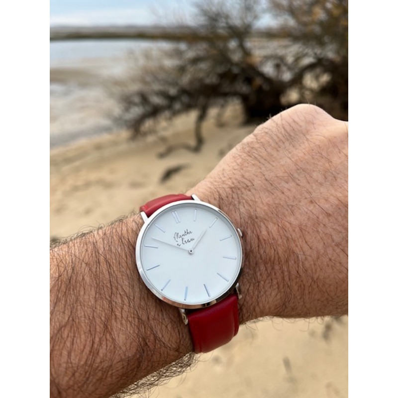 Boîtier métal brillant finition chromée : Ø 40 mm (homme) - Cadran blanc avec index assortis Montre fournie dans son écrin luxe spécifique Bracelet 20 mm cuir véritable rouge Montre fabriquée en France à Besançon. Étanchéité : 3/ATM-Éclaboussures