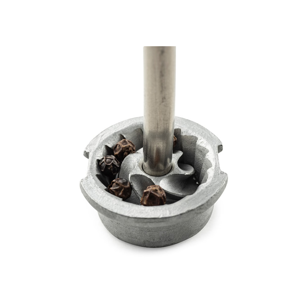 Moulin à poivre Paris Select, fabriqué en France par PEUGEOT SAVEURS. Fabriqué à partir d'aluminium strié monté sur une base en bois provenant de forêts locales certifiées PEFC, ce moulin manuel offre une combinaison de matériaux de qualité. Chaque moulin est équipé d'un bouton de réglage de la mouture situé sur le dessus : en le serrant davantage, vous obtenez une mouture plus fine.
