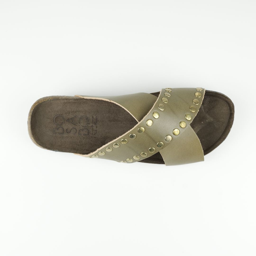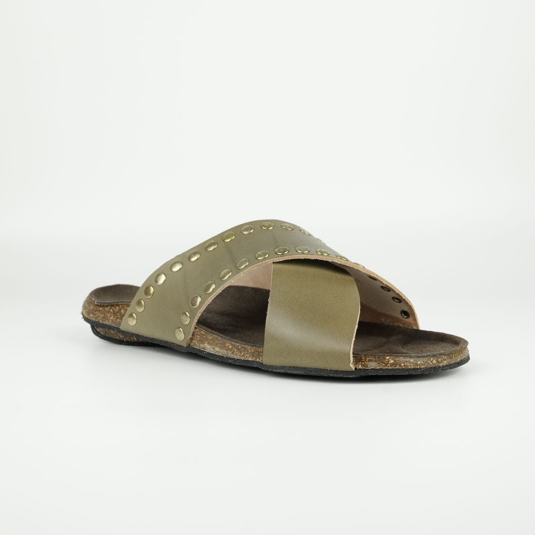 Élégante, la mule Louane illumine avec ses rivets. Les deux brides entrecroisées font toute l'élégance de la chaussure qui affine et habille votre pied. Sa semelle en liège est robuste et offre un très grand confort en toute circonstance.