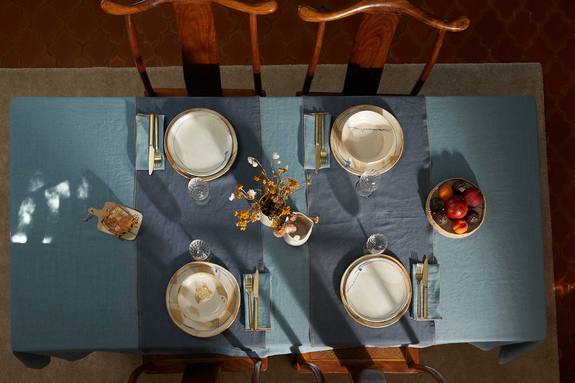 - Une nappe bordée d’un fin bourdon cuivré mettant en valeur chacune des couleurs proposées.