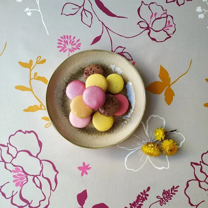 Nappe Camélia en coton enduit Nappe fleurs coton enduit fabriquée dans les Vosges 100% made in FranceNappe fleurie imperméable, anti-tache et déperlanteImpression du tissu certifié Oeko-Tex classe I, enduction sans produits toxiques, sans PVC, sans phtalates