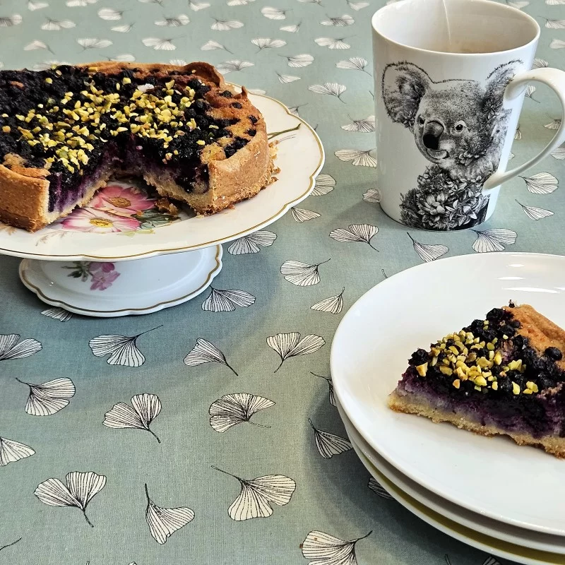 Nappe ginkgo coton enduit fabriquée dans les Vosges 100% made in FranceNappe fleurs de gingko imperméable, anti-tache et déperlante Impression du tissu certifié Oeko-Tex classe I, enduction sans produits toxiques, sans PVC, sans phtalates Elle existe aussi en vert pistache , en doré et en ginkgo sable.