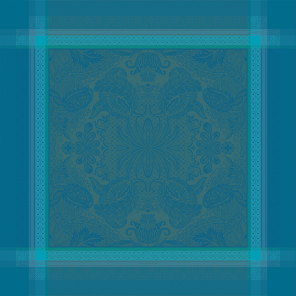 La nappe Isaphire, est réalisée en France par Garnier Thiebaut. C'est un modèle plein de charme et de fantaisie, qui mêle les courbes de plumes stylisées et les lignes colorées de liserés entrecroisés. Le dessin très soigné et qualitatif est obtenu grâce au tissage "en compte serré".