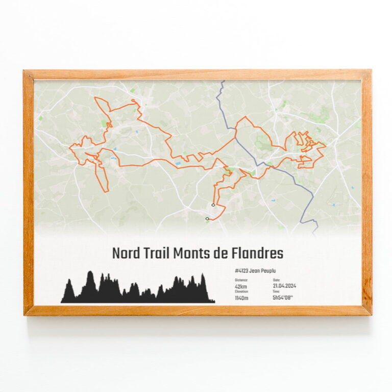 Cette affiche du parcours du 42km du Nord Trail Monts de Flandres est imprimée sur du papier photo brillant haute qualité.Pour créer un poster personnel et unique, ajoutez votre numéro de dossard, votre nom, prénom, votre temps d'arrivée ou le texte que vous souhaitez.