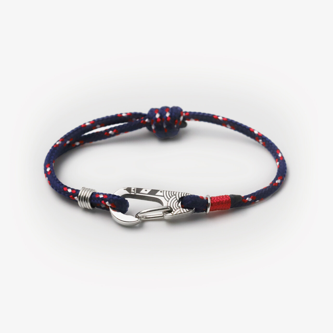 Bracelet pour femme Bracelet réglable grâce à son nœud coulissant Tour de poignet allant de 15cm à 20cm Mousqueton en acier inoxydable de 26mm * 11.5mm * 3mm Paracorde 425 (3mm) : Navy - Bleu, rouge et blanc Nanoparacorde : Rouge Anneaux : Acier inoxydable Oberalp : Phare perdu dans les alpes