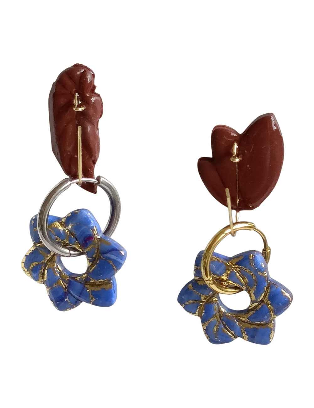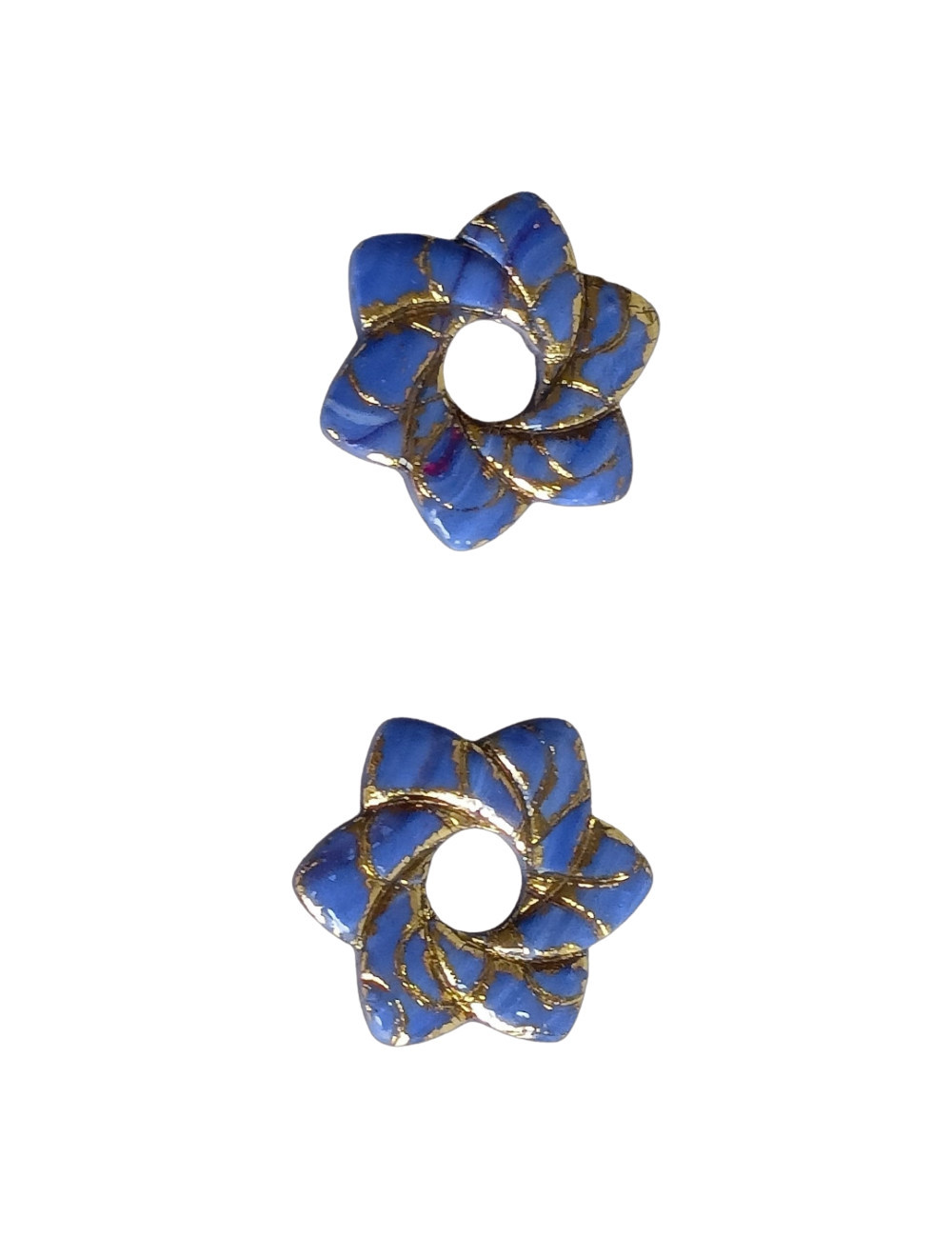 Matériau : Pâte polymère cuite, avec incrustations de poudre ou feuille d'or pour l'effet kintsugi.Forme : Étoile octogonale (8 pointes), percée au centre pour assemblage.Couleurs : Bleu intense dominant, accents dorés veinés pour un contraste éclatant. Ces pampilles sont des créations artisanales en pâte polymère, modelées sous une forme étoilée à 8 branches, évoquant une fleur stylisée ou un mandala délicat. La base est d'un bleu cobalt profond et satiné, rehaussé par des veines et fissures dorées inspirées de la technique japonaise du kintsugi .Vendu par paires Forme étoile Couleurs : bleu et doré Les créoles pas vendu avec Vernis résine UV Pas laisser à la portée des enfants