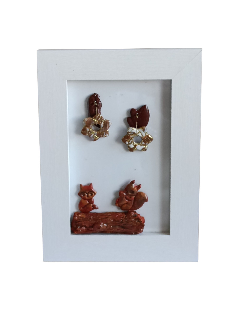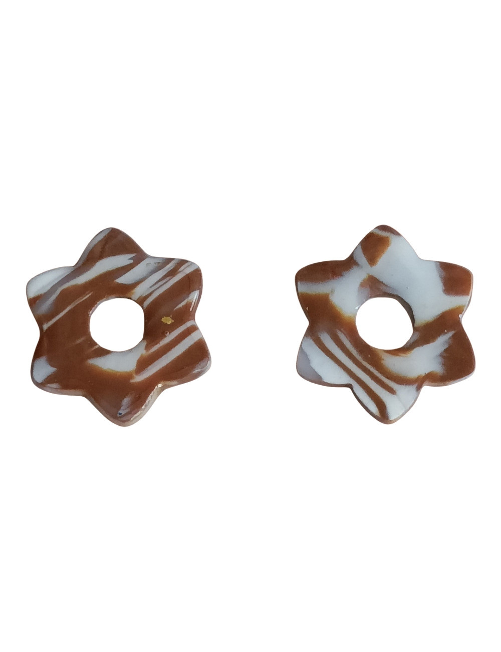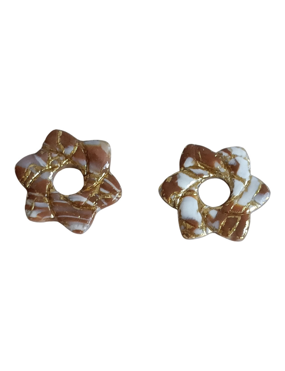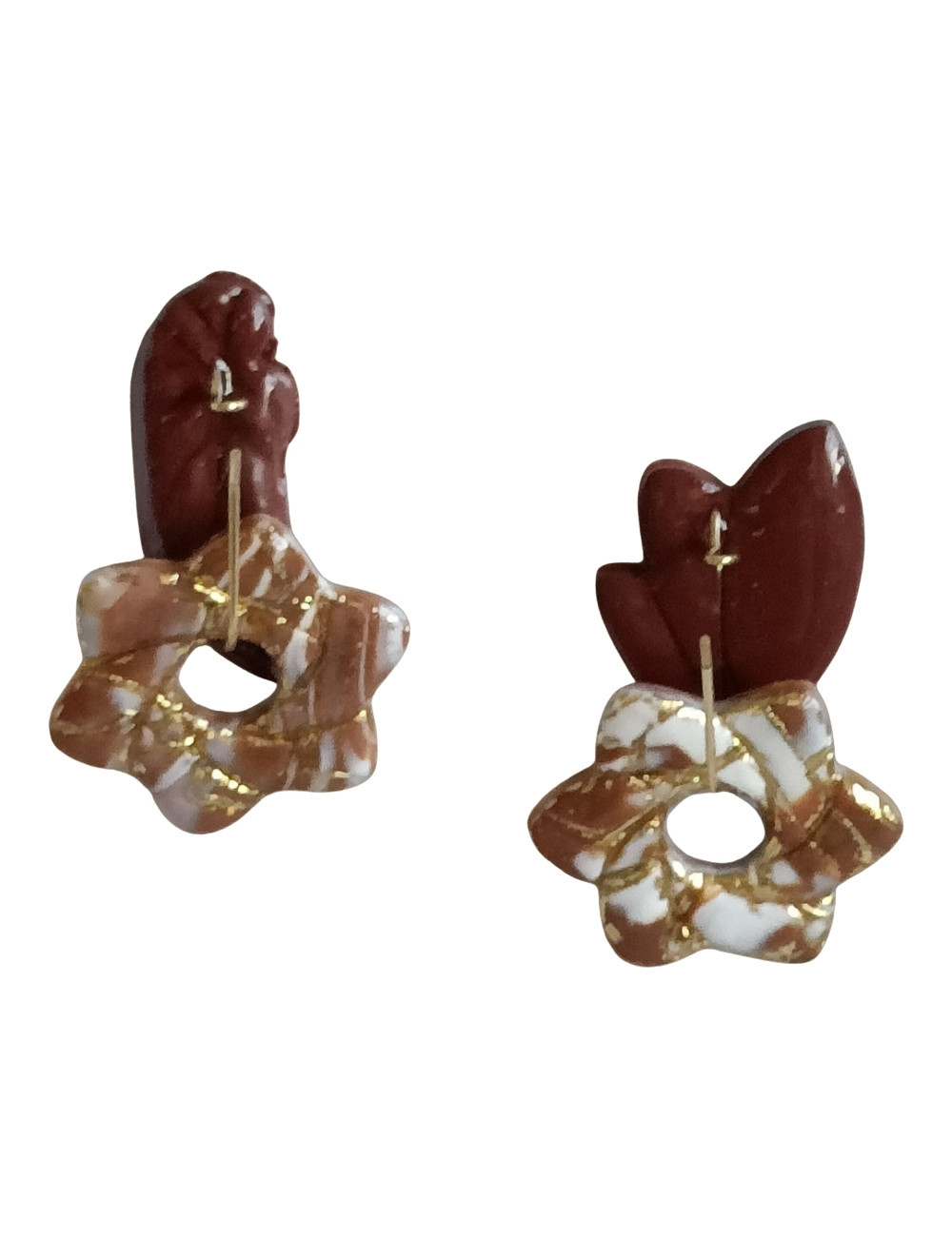 Ces boucles d'oreilles pendantes sont réalisées en pâte polymère et présentent un design floral unique. Chaque pièce arbore une forme étoilée à cinq pétales avec un centre creux, orné d'un motif marbré mêlant des teintes blanches, marron clair et des accents dorés scintillants. Une feuille stylisée en rouge bordeaux profond surmonte chaque fleur, ajoutant une touche élégante et contrastée Matériaux : Pâte polymère cuite, peinture marbrée (blanc, marron, doré), tiges métalliques dorées.Design : Forme florale étoilée à 5 pétales, motif marbré avec feuille rouge bordeaux, structure légère et asymétrique.Style : Pampilles pendantes, esthétique bohème chic, parfaites pour un look quotidien ou événementiel.Entretien : Protéger de l'humidité ; nettoyer avec un chiffon doux. Chaque paire est unique, faite à la main.Occasions : Idéales avec des tenues fluides, robes d'automne ou tenues festives.