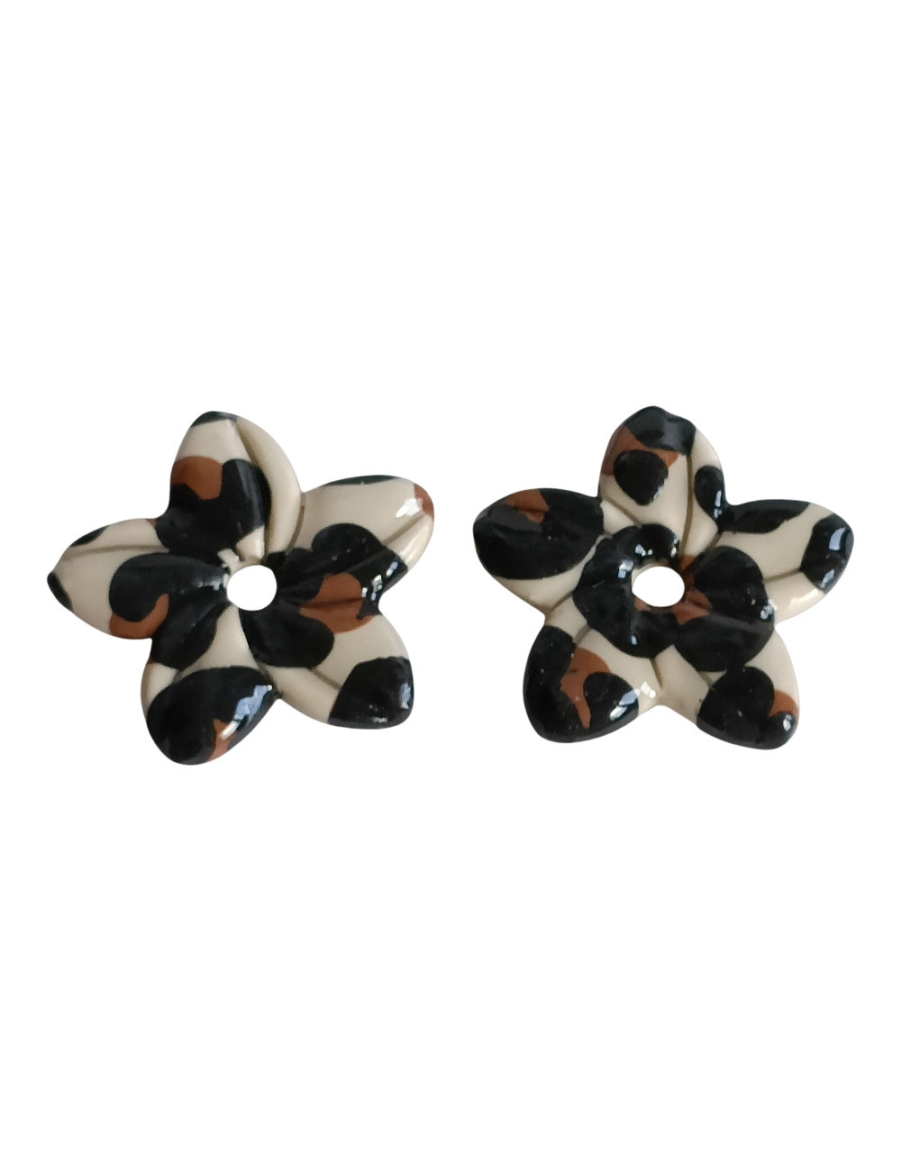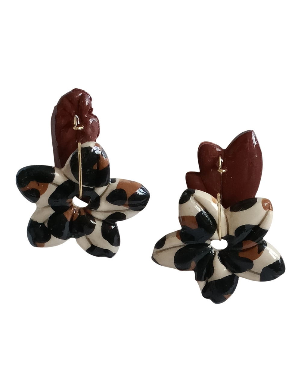 Matériaux : Pâte polymère cuite, motifs peints à la main, tiges en métal doré hypoallergénique.Design : Forme florale abstraite avec 5-6 pétales texturés en motif léopard (noir/beige/marron), accents de feuilles en rouge bordeaux.Style : Pampilles pendantes, asymétriques, légères , idéales pour un look ethnique ou tendance animal print.Entretien : Éviter l'humidité ; nettoyer avec un chiffon doux. Fabriquées à la main, chaque paire est unique.Occasions : Bijoux quotidiens ou événements, polyvalents avec robes fluides, jeans ou tenues sophistiquées. Ces boucles d'oreilles pampilles, entièrement réalisées à la main en pâte polymère, adoptent une forme audacieuse et organique inspirée de fleurs épanouies. Chaque pièce présente un motif léopard sophistiqué, avec des taches irrégulières alternant entre du noir profond, du beige crème et des touches de marron chaud, pour un effet texturé et animalier captivant.Les pampilles sont vendues par paires Une légère différence entre la couleur peut être notable entre la photo et le réalité.Pas laisser à la portée des enfants
