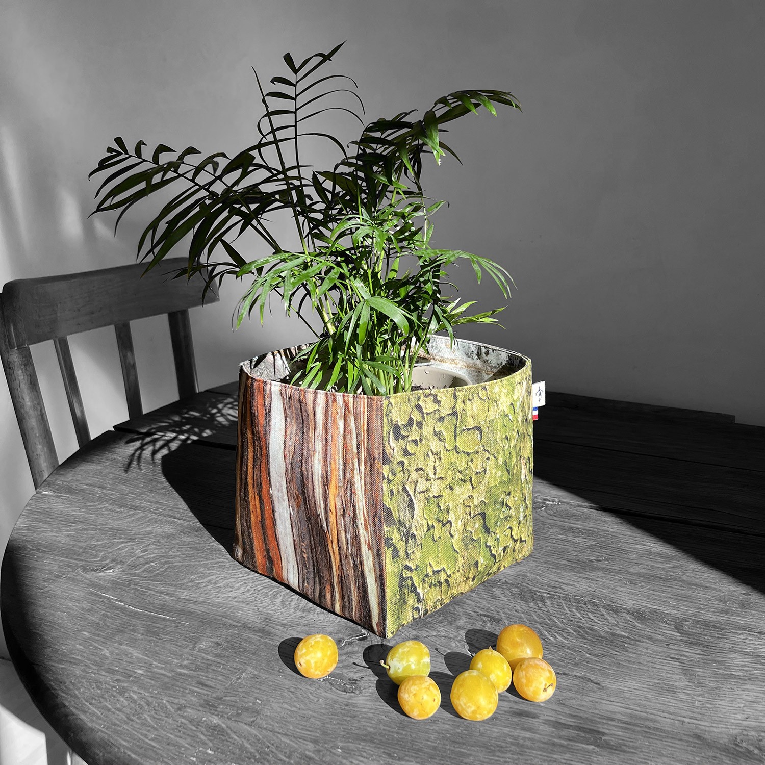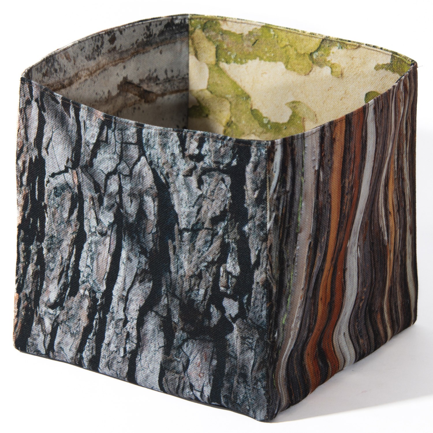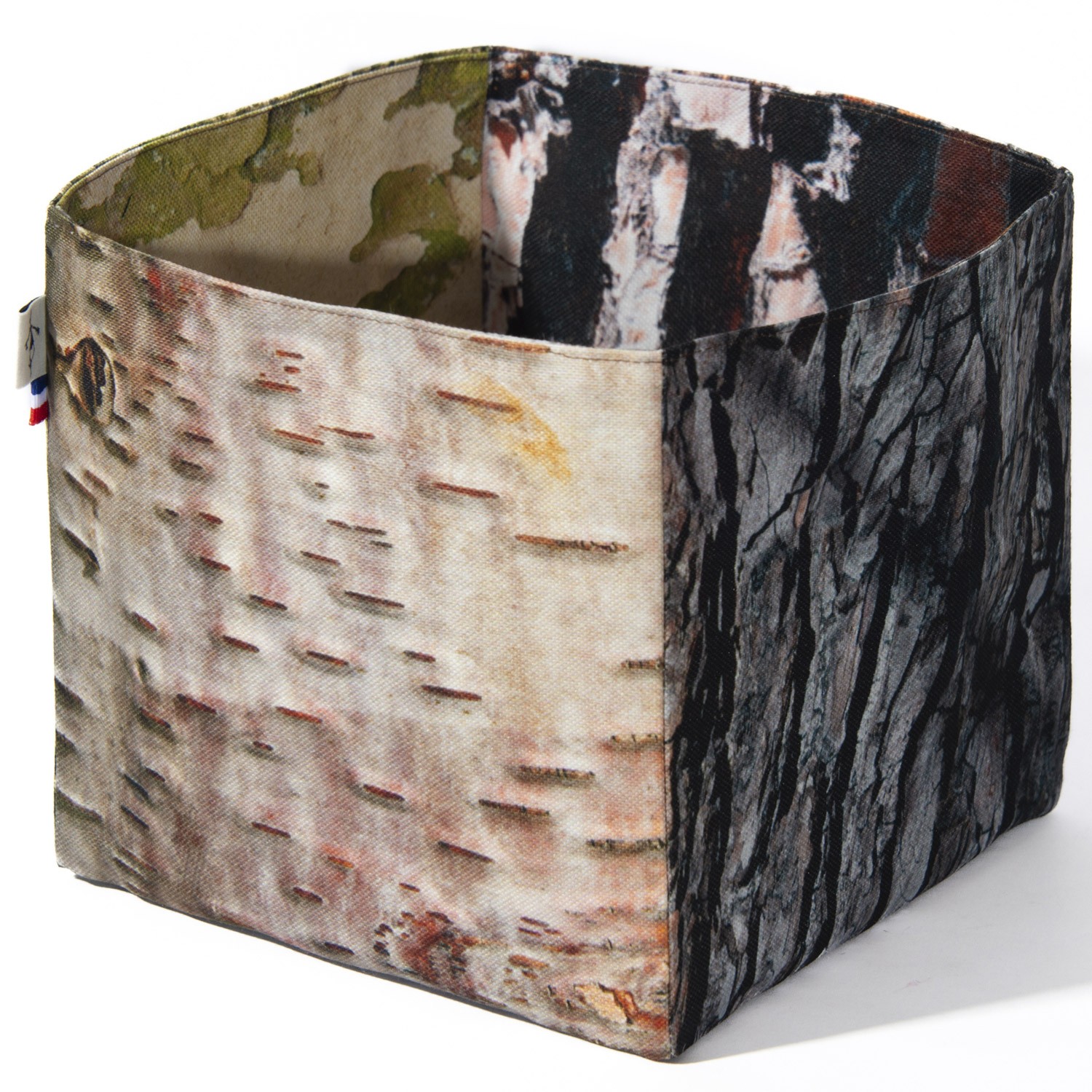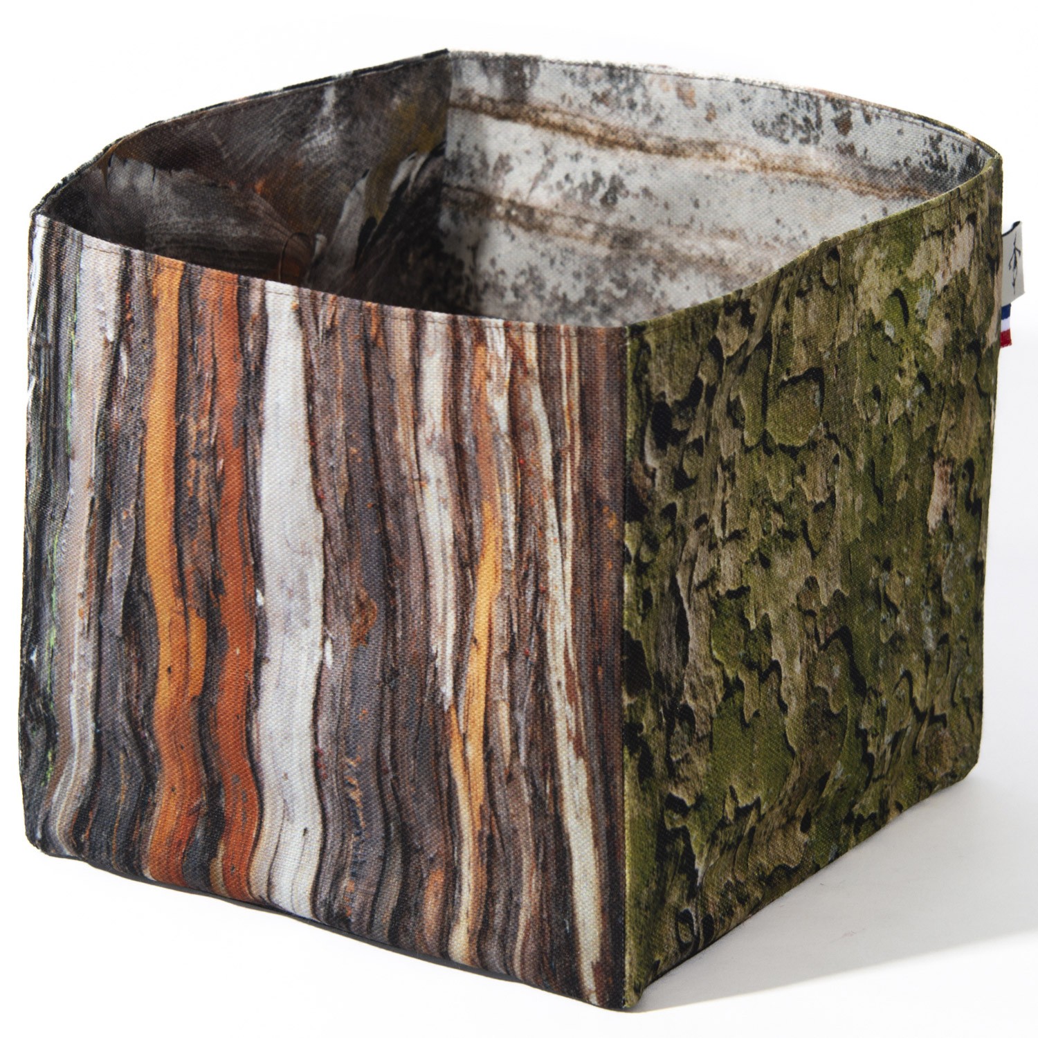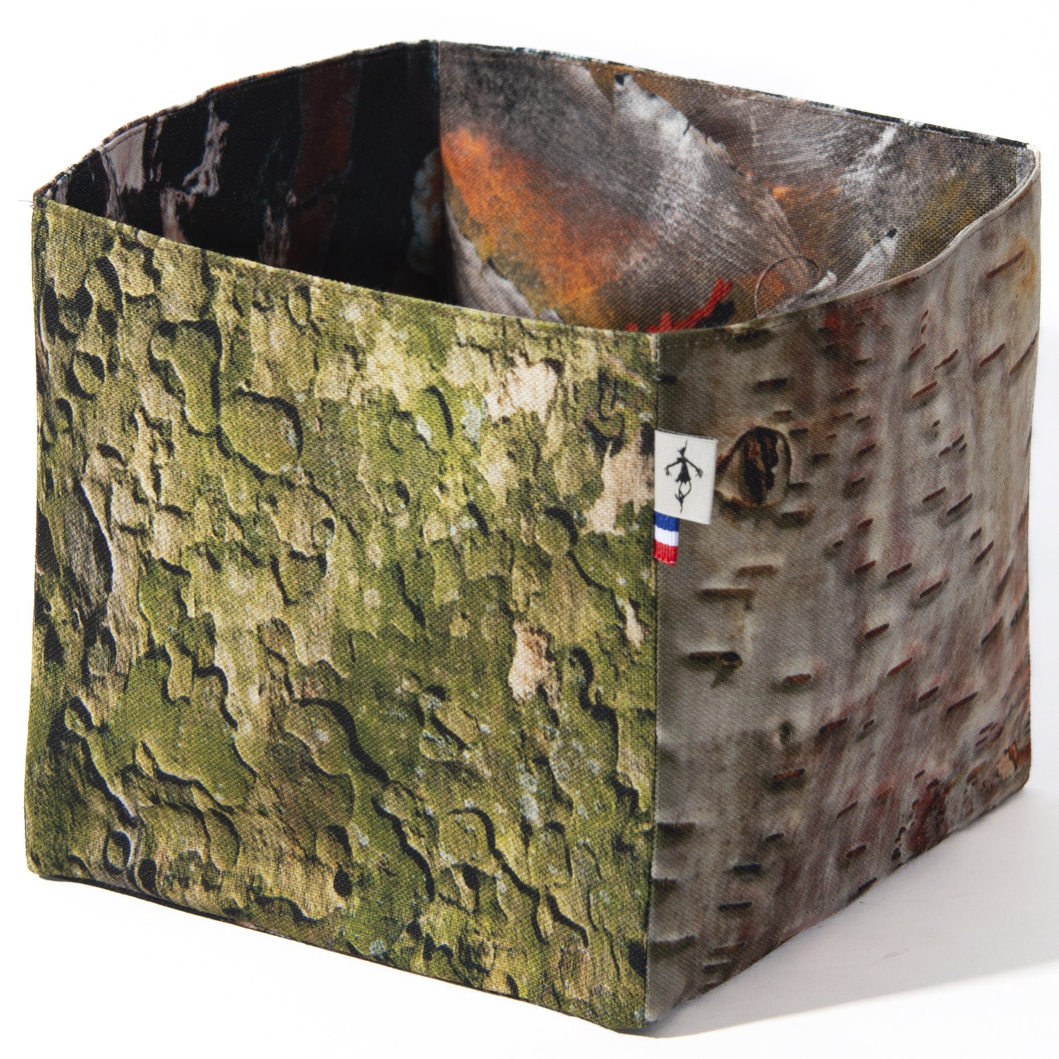 Maron Bouillie vous emmène en forêt avec ce panier de rangement bois écorces. Imprimés de toutes part de photos de bois, ces corbeilles en tissu sont uniques.