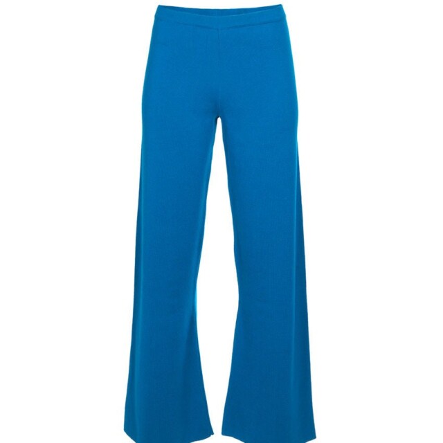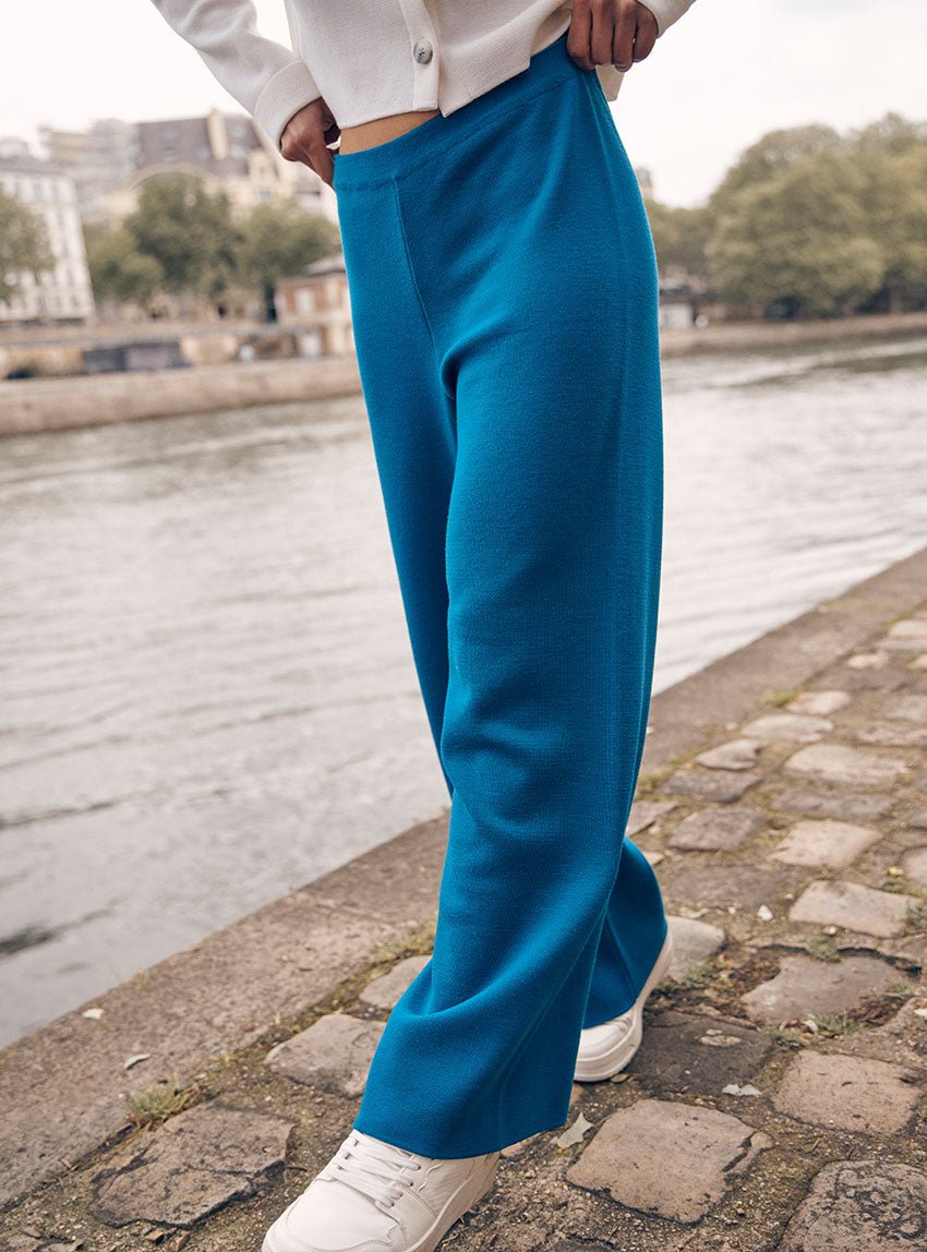 Le pantalon Alexia en bleu paon séduit par sa profondeur chic et singulière. Sa maille Point de Rome lui assure un tombé structuré, tandis que sa coupe large et sa taille haute allongent la silhouette avec élégance. La ceinture élastique noire ajoute confort et contraste. Un pantalon qui attire les regards sans en faire trop; puissant, mais tout en nuance