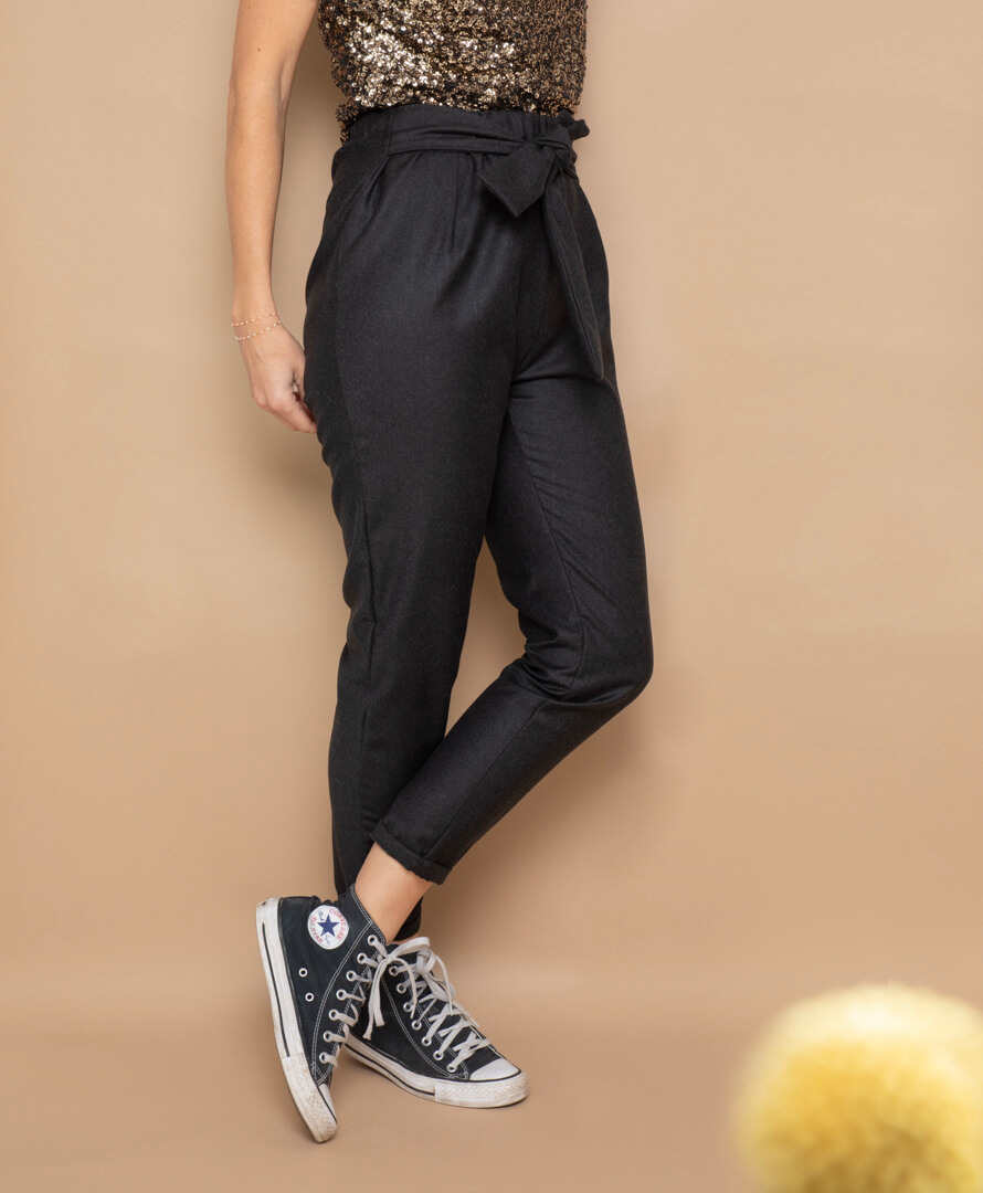 Le pantalon Côme dans sa version hiver (même coupe que le modèle Hellébore, la ceinture à nouer en plus). Confectionné dans un tissu 100% laine, noir, d'une très belle qualité (upcyclé : fin de rouleaux d'une marque de Prêt à Porter Haut de Gamme).