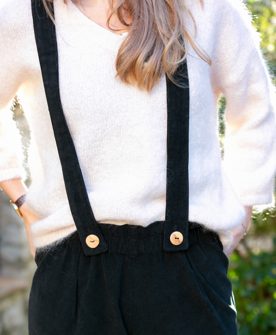 Hellébore, le pantalon à bretelles en velours côtelé qui donne un style fou ! Ici dans sa version noire. On adore sa coupe ajustée, ses deux gros boutons en bois à l'avant et ses bretelles amovibles.