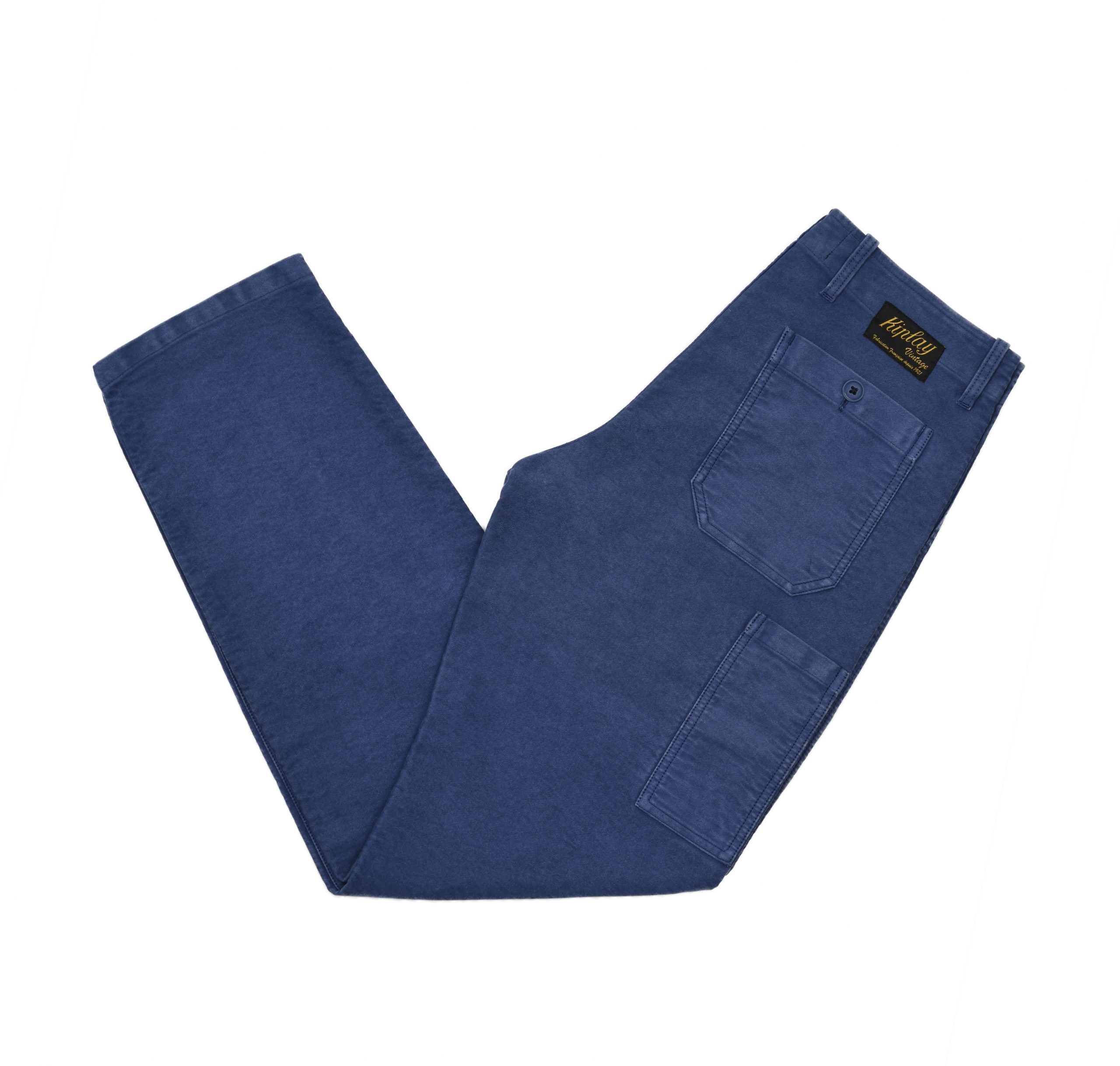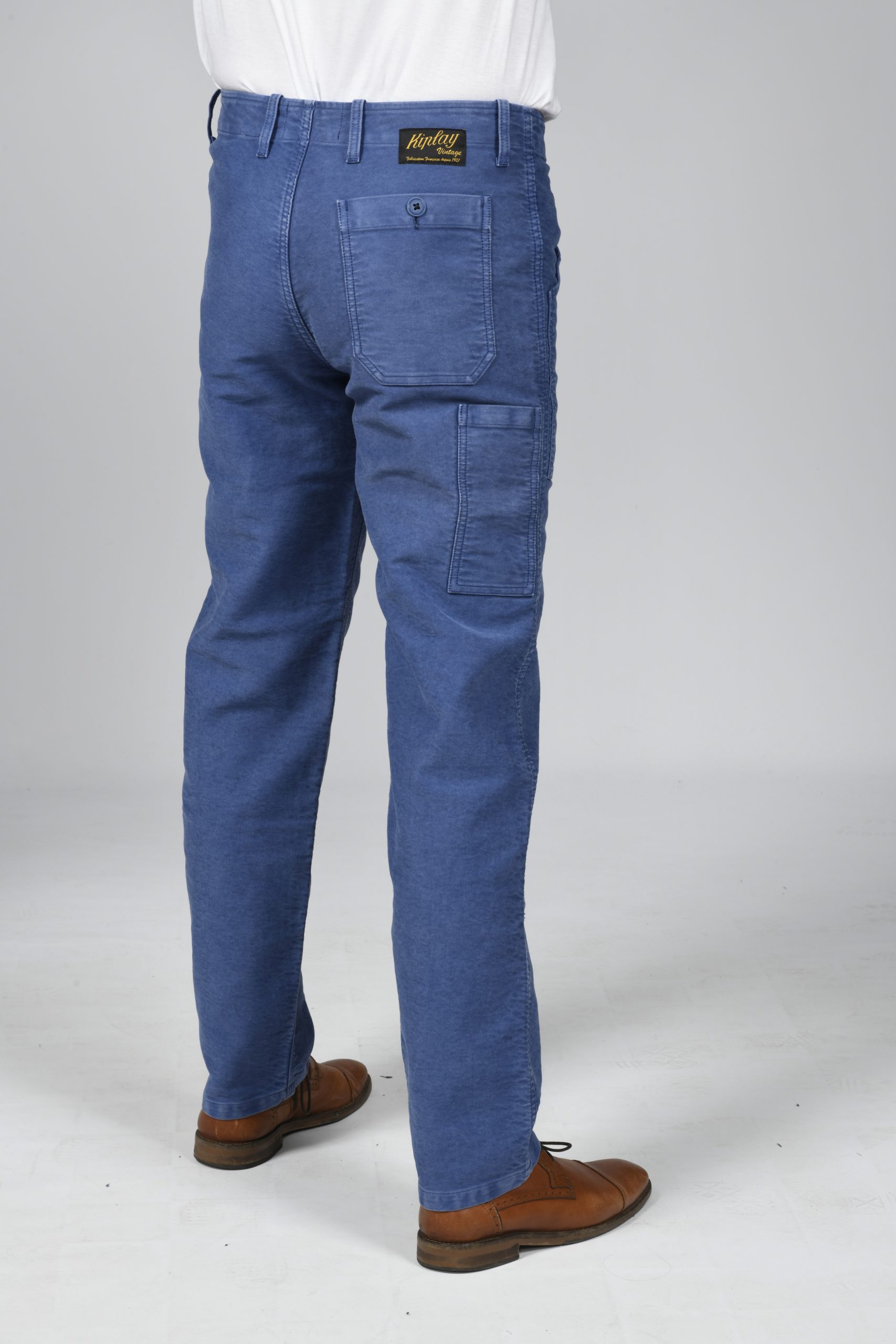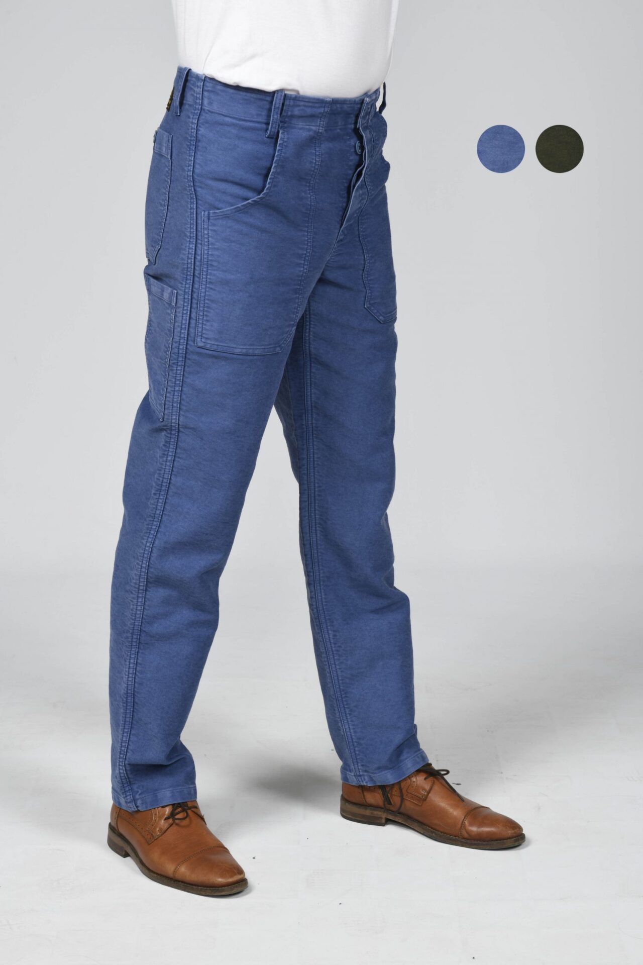Pantalon de travail en moleskine style charpentier décontracté, basé sur les vêtements de travail des années 1920.Le coloris bleu est la référence du « bleu de travail » des ouvriers de l’époque.Confectionné en France en :Moleskine 100% – Coton 390Gr/m².Détails :
