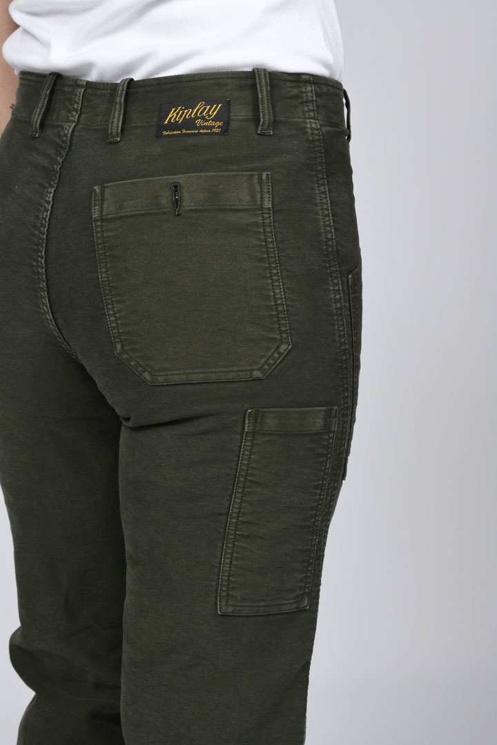 Pantalon de travail en moleskine style charpentier décontracté, basé sur les vêtements de travail des années 1920.Le coloris bleu est la référence du « bleu de travail » des ouvriers de l’époque.Confectionné en France en :Moleskine 100% – Coton 390Gr/m².Détails :