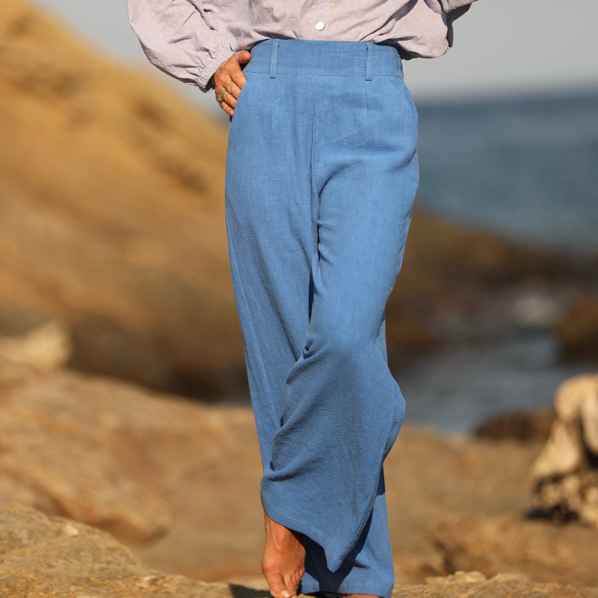 Tom, avec ses jambes larges, ses pinces piqués à la taille et son dos élastiqué, c'est un pantalon chic et confort. Deux poches côté viennent habiller ce pantalon.