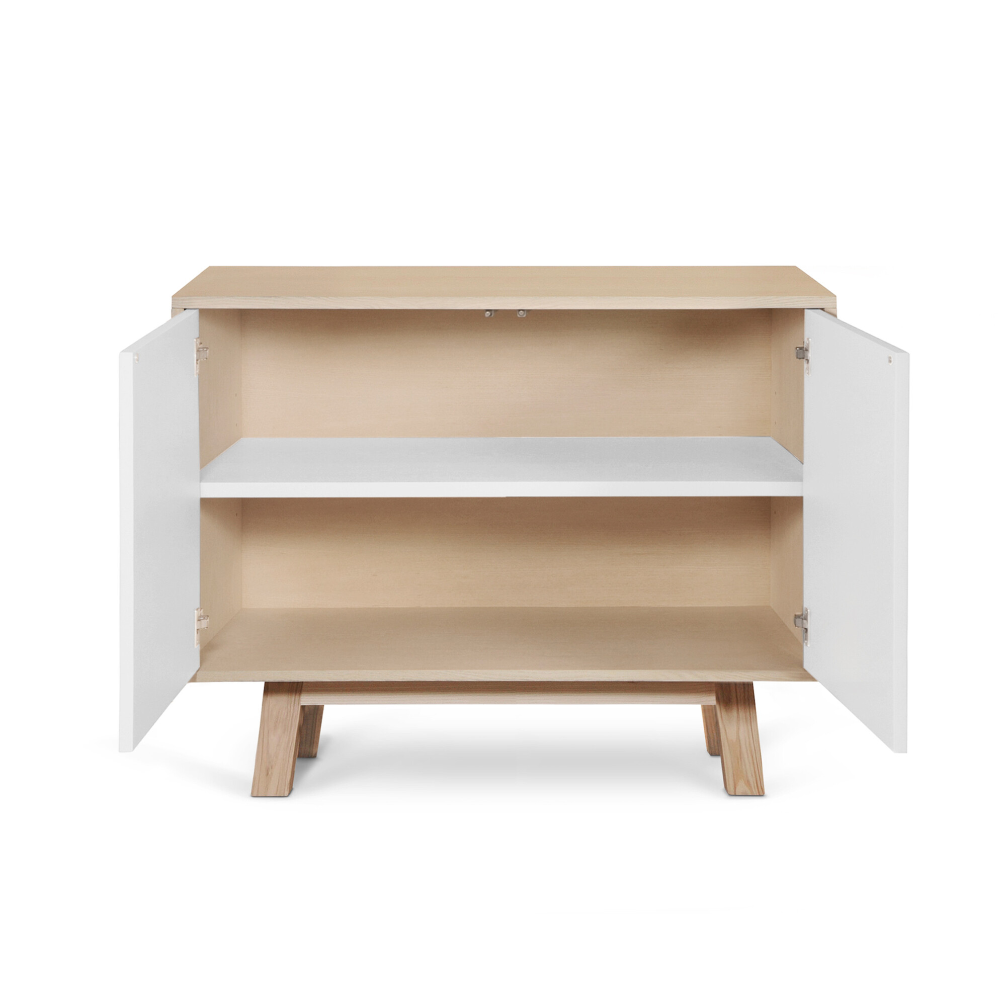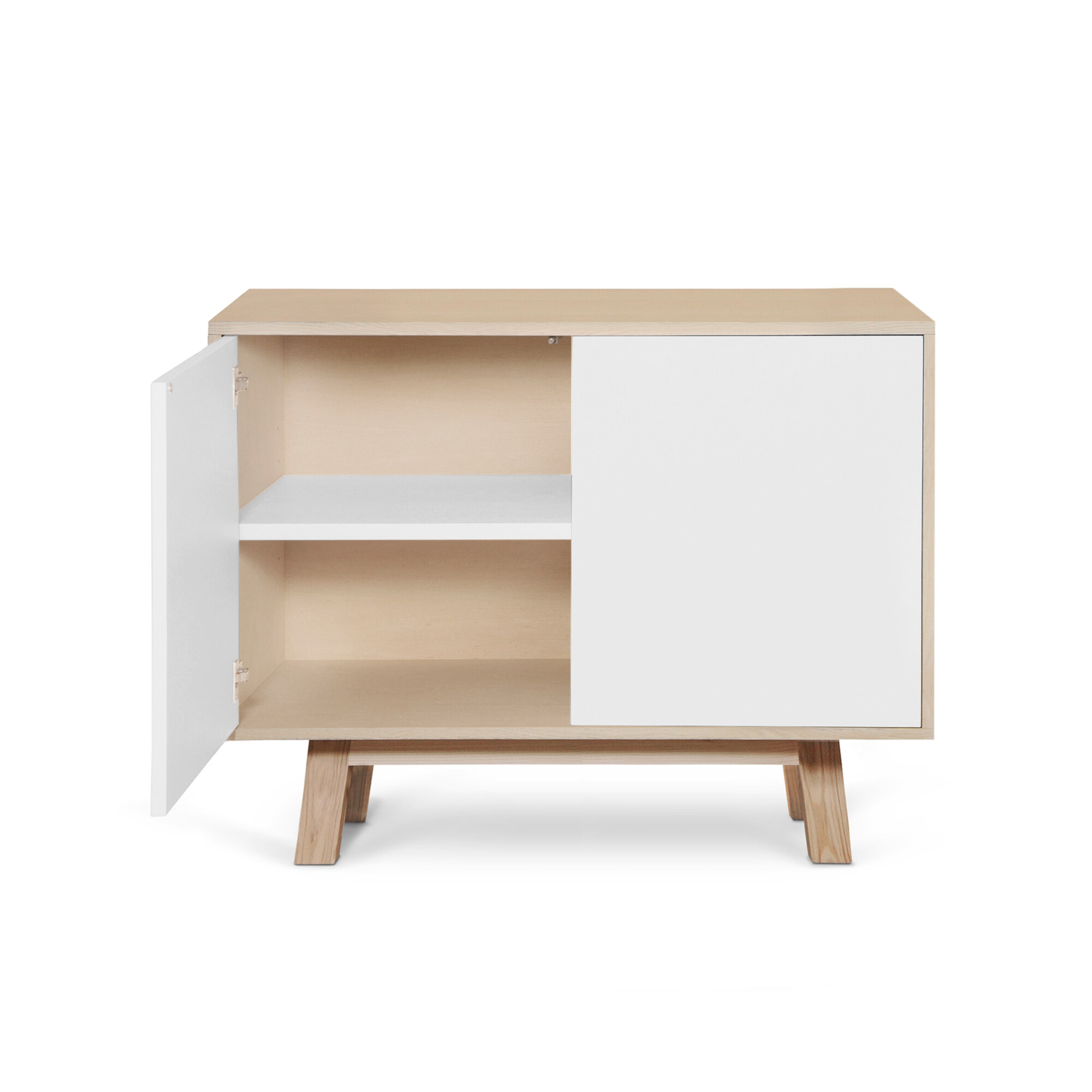 Ce petit buffet en bois massif bas 2 portes KUBE peut aussi être utilisé comme commode ou cabinet dans une chambre, une entrée ou une cuisine. Il est présenté ici en frêne et est disponible également en chêne. Il sera livré, entièrement monté, chez vous dans la pièce et sur rendez-vous par 2 livreurs.