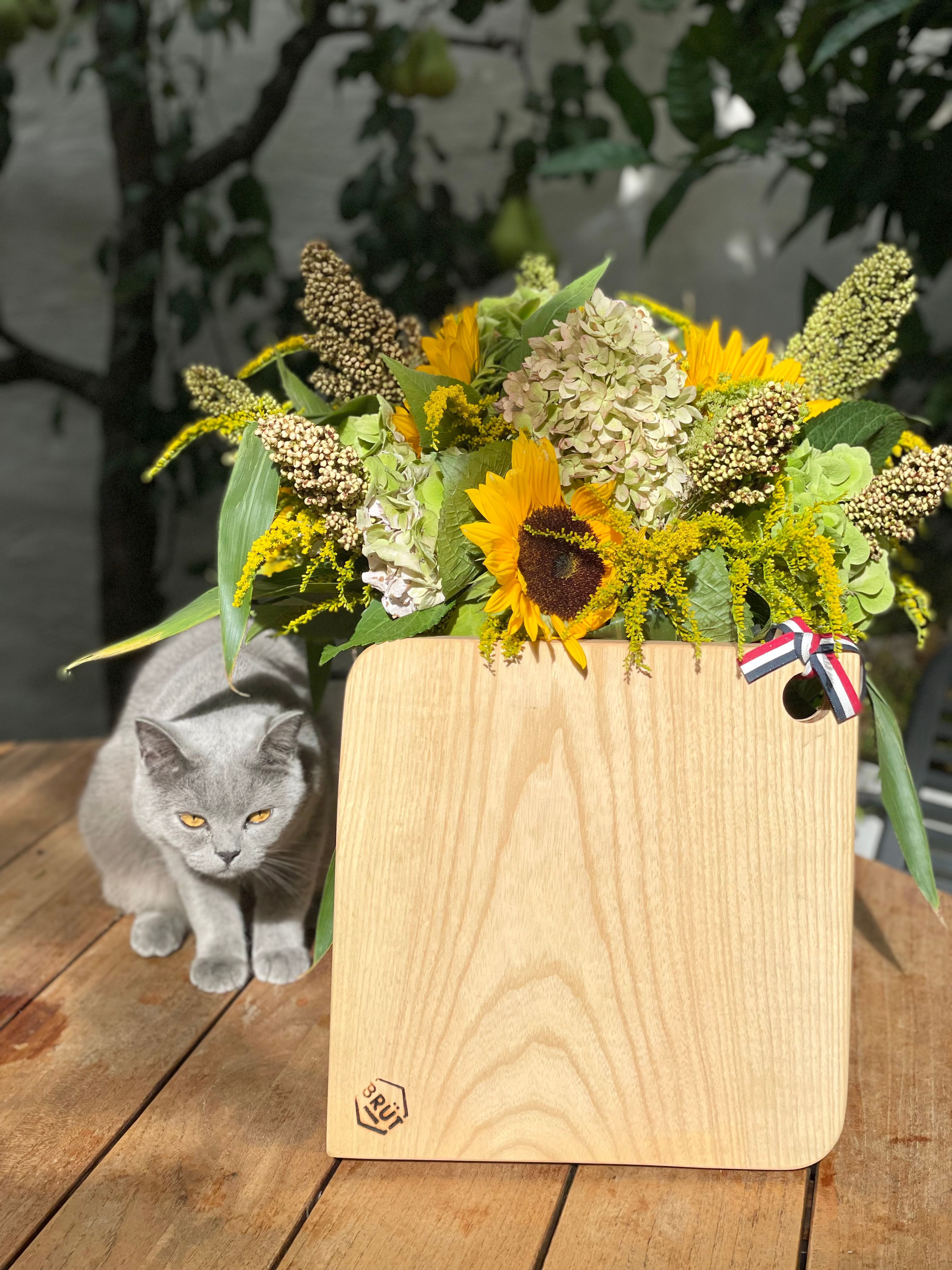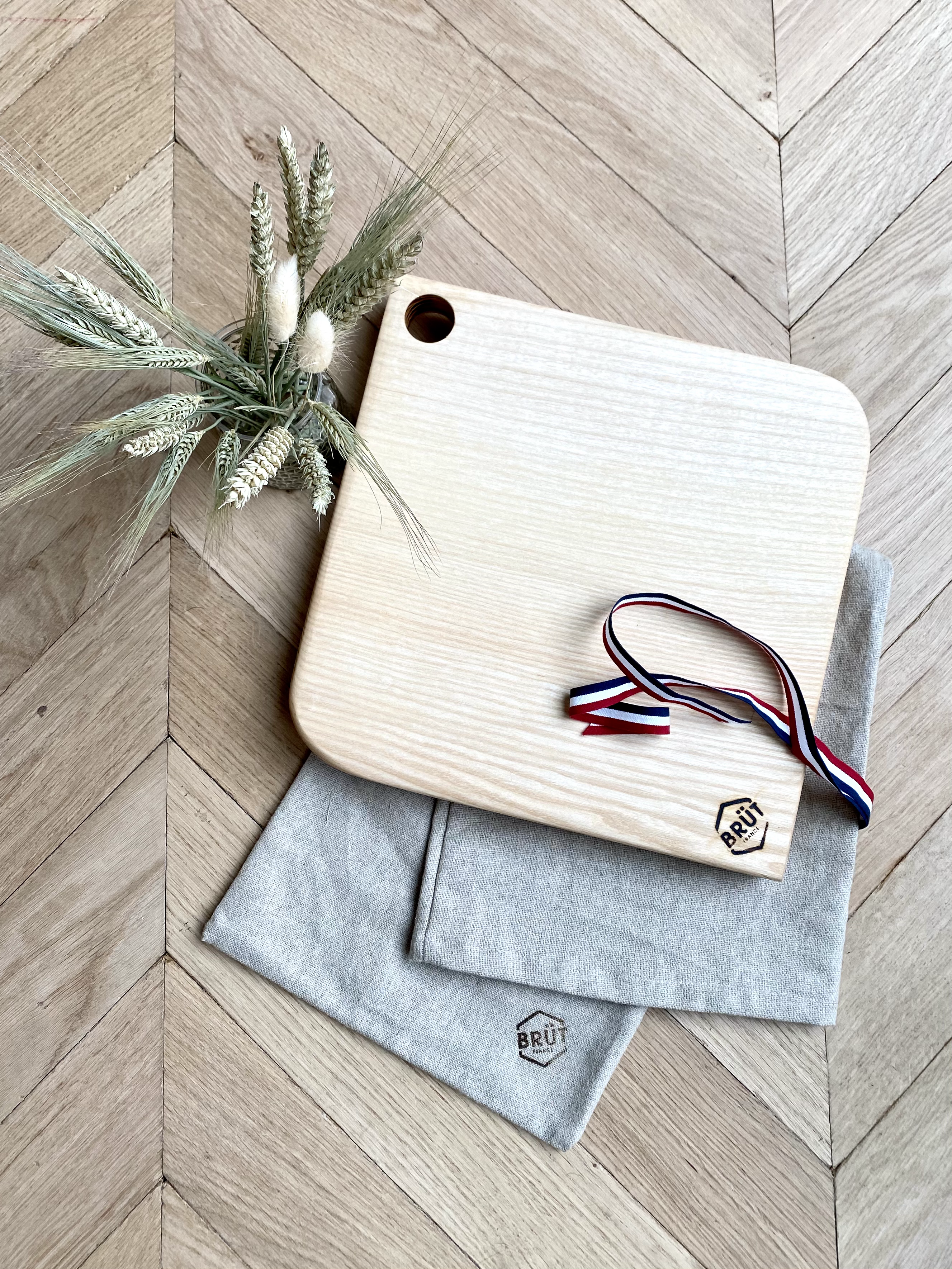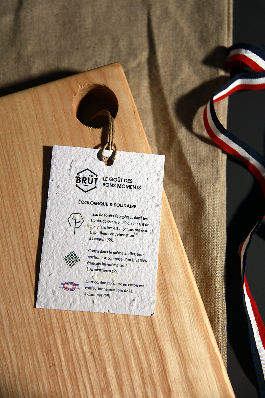 BRÜT vous propose des planches de présentation et de découpes en bois massif, de chêne et de frêne. Les planches sont découpées dans la masse et emballées dans un pochon en lin réutilisable. Tout provient et est fabriqué dans un rayon de 40 km autour de Lille.