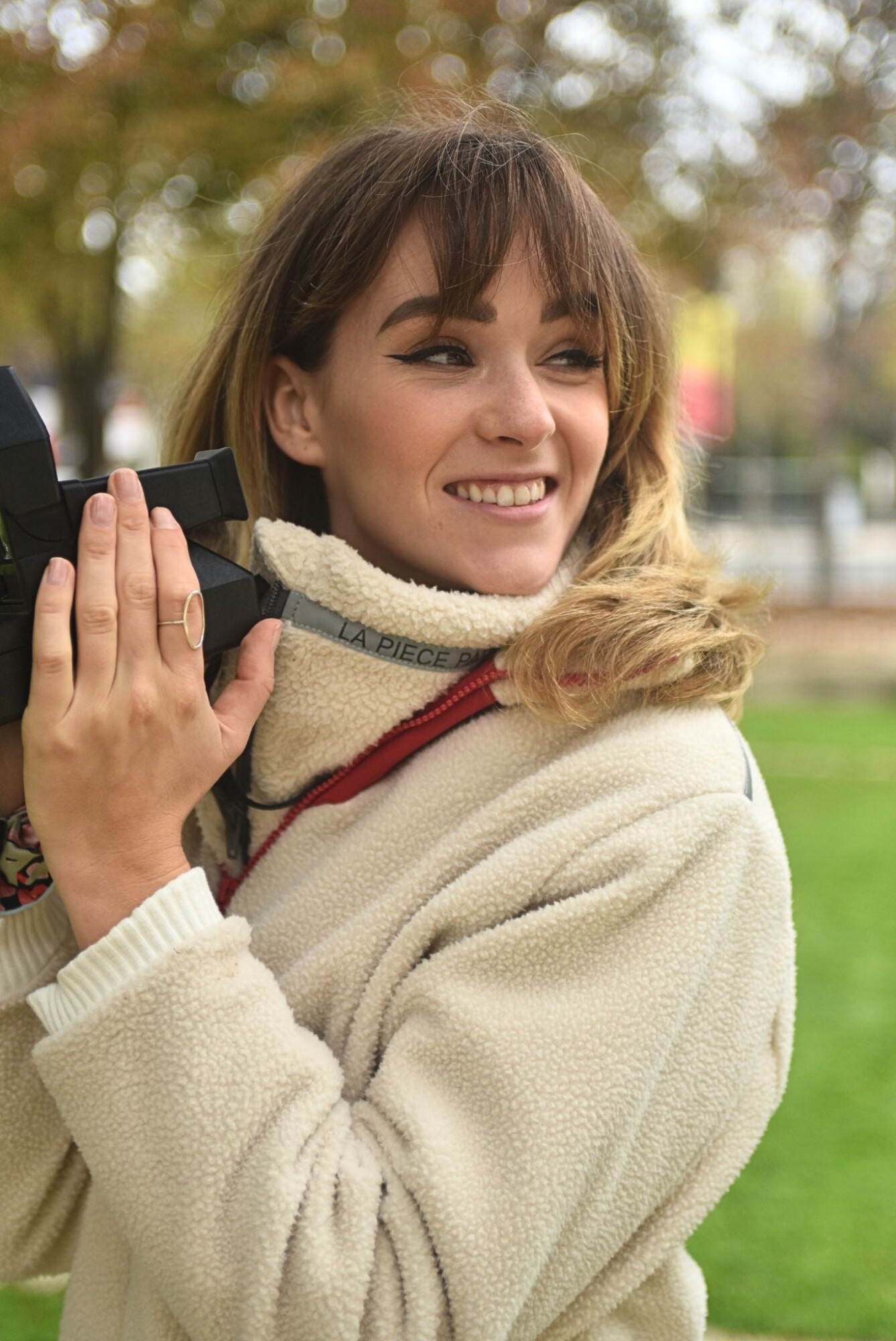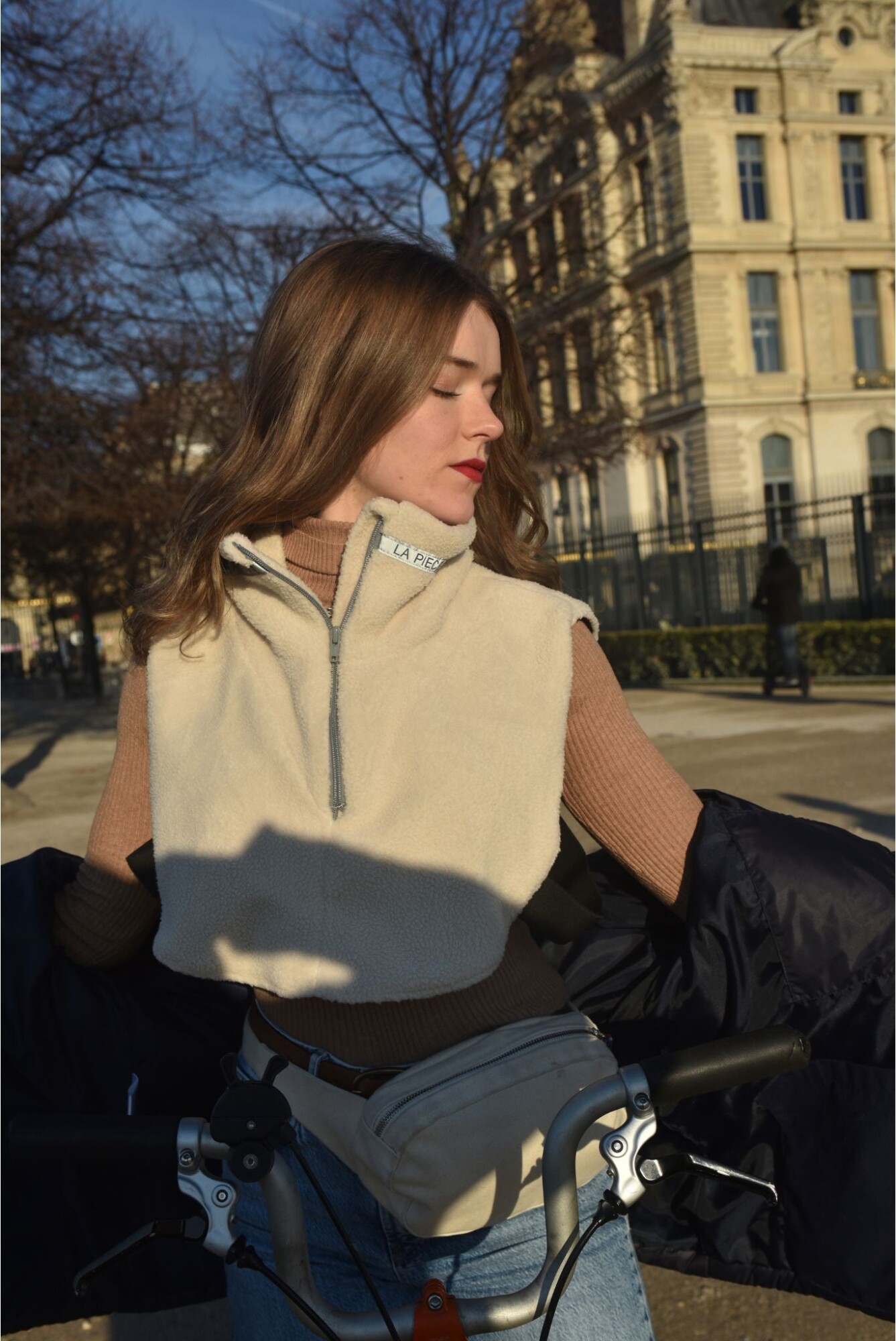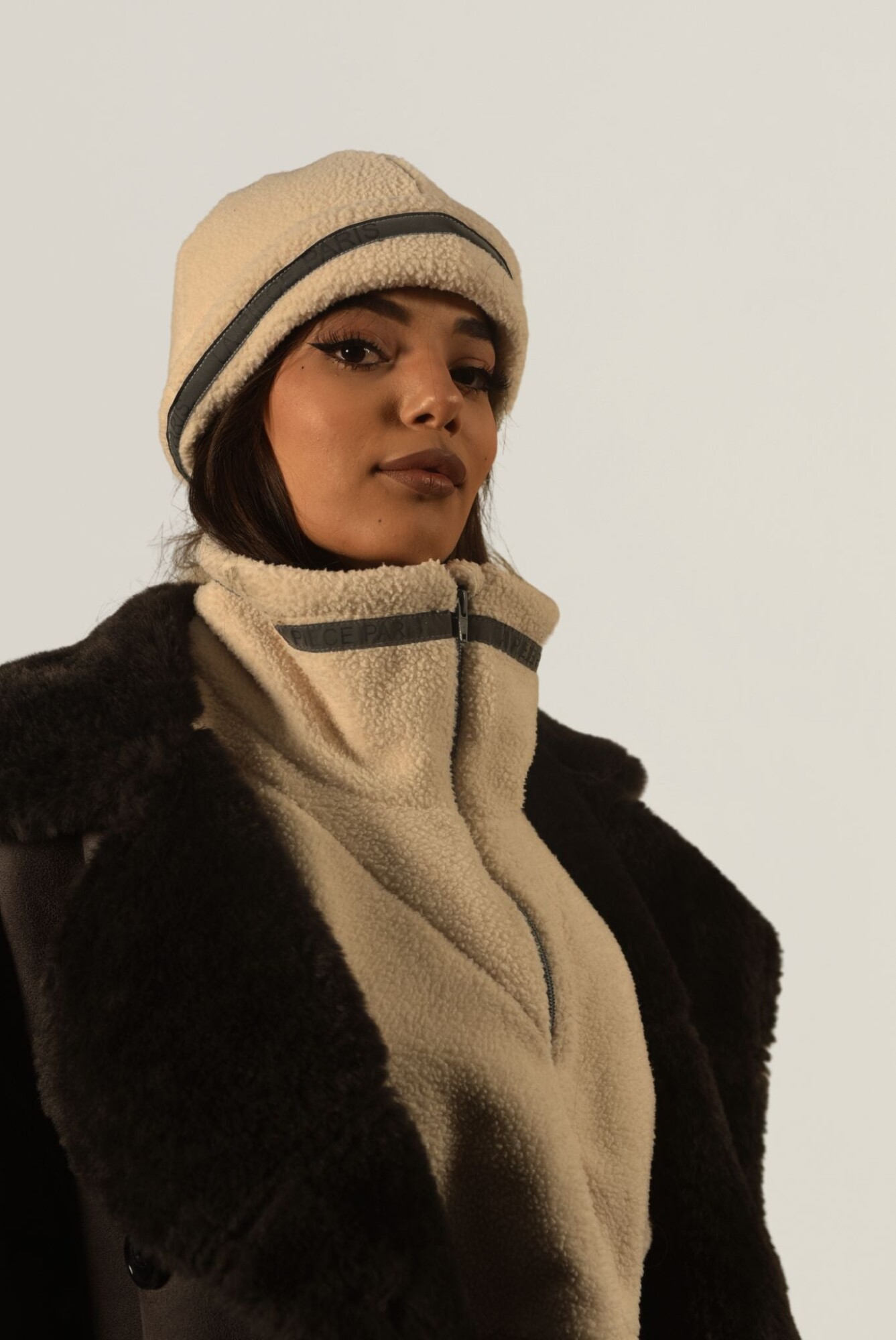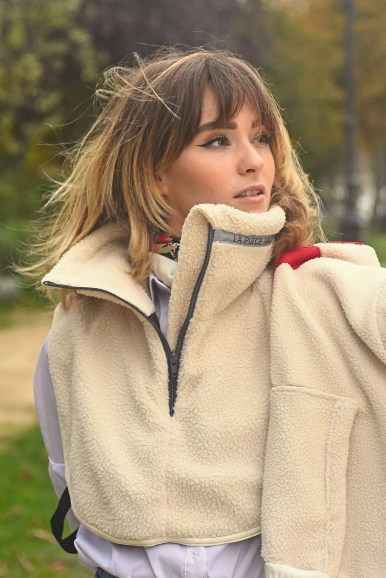 Accessoire signature de La Pièce, le plastron moutonné ANGEL II est conçu en imitation peau de mouton, assorti d'une bande réfléchissante