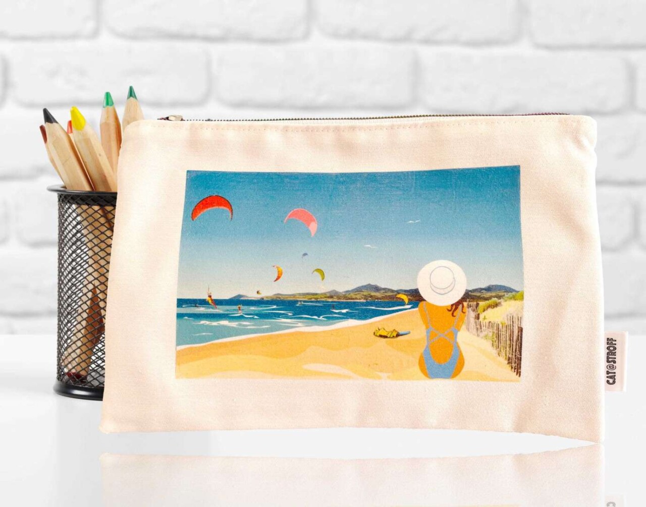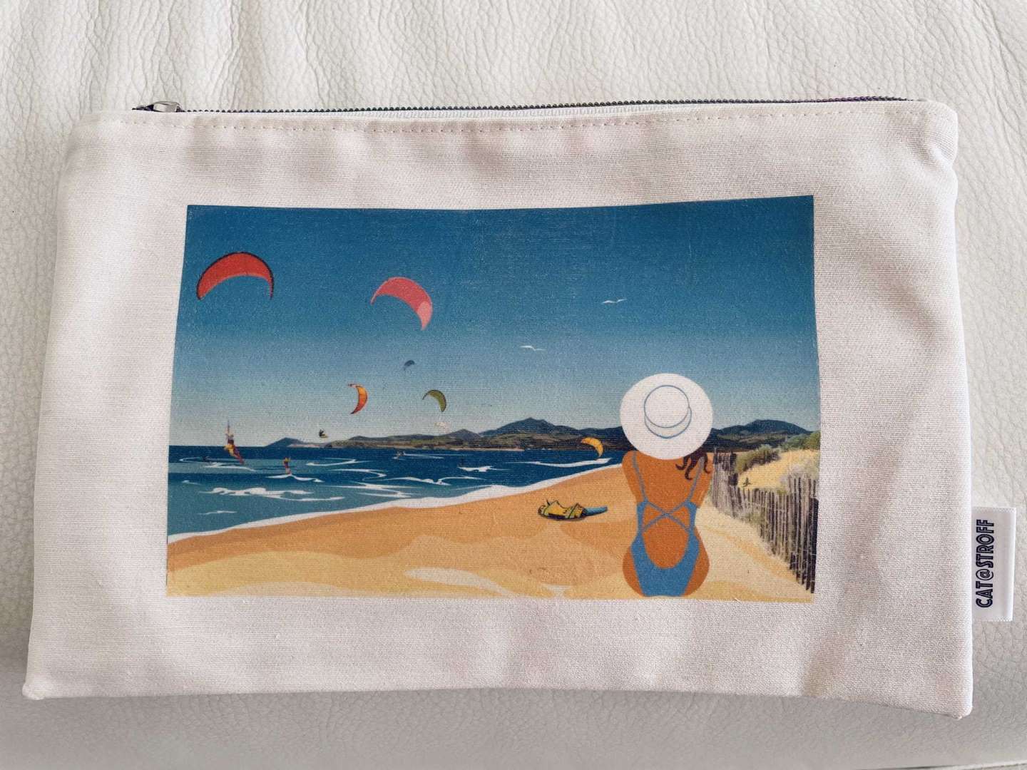 Osez l'originalité avec cette pochette Plage de Saint-Cyprien, dont l'illustration a été réalisée en Occitanie puis la découpe, l'assemblage et la couture à Rennes. Tous les tissus utilisés pour l'intérieur et l'extérieur proviennent de France et sont certifiés Oeko-Tex - 100% Coton. Sa couleur écru fait ressortir les couleurs de l'illustrations et s'accordera avec toutes vos tenues.Un travail artisanal et familial, dans lequel Foliove s'est associé à Cat@stroff pour vous proposer cette trousse originale et colorée (jusqu'à la fermeture éclair !)