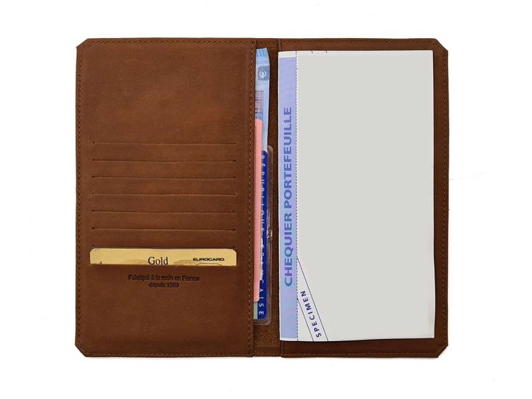 Porte-chéquier portefeuille en cuir, avec angles biseautés.8 logements format carte de crédit.1 emplacement pour billets et/ou papier d'identité1 emplacement pour chéquier "portefeuille"