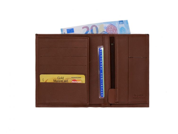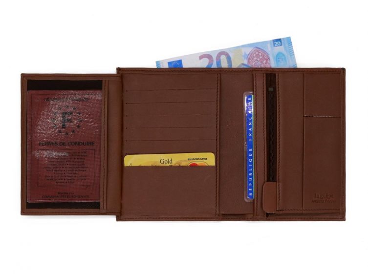 Polyvalent, ce portefeuille en cuir 3 volets est idéal pour emporter un grand nombre de cartes (x13), des pièces de monnaie, des billets, votre carte d'identité ainsi que votre passeport !Article personnalisable.Son format standard (15cm) vous permet de ranger aussi votre carte grise.Ce portefeuille se différencie par son cuir et sa qualité de fabrication. Vous entrez dans l'univers du luxe sans en payer le prix.Cuir français de qualité supérieure.Fabrication française dans un atelier labellisé Entreprise du Patrimoine Vivant (EPV)Voir la version avec une patte de fermeture.