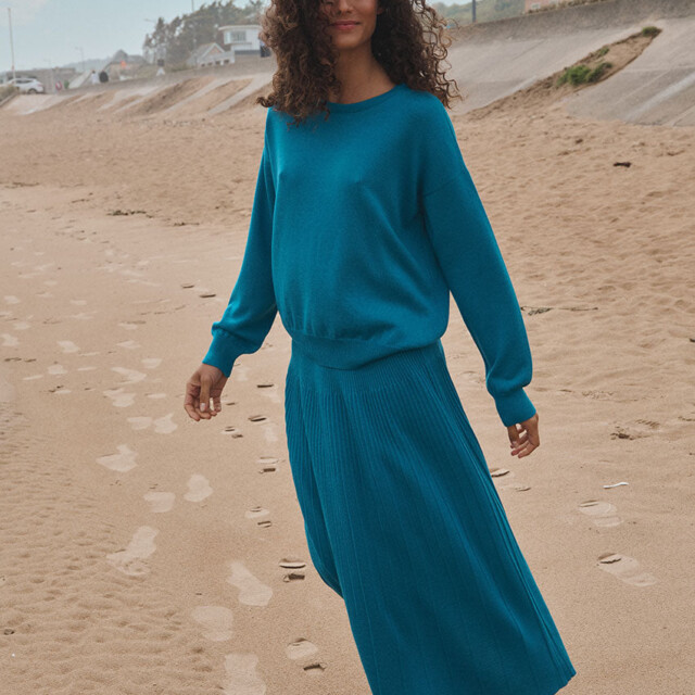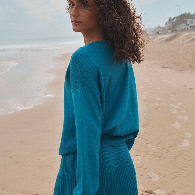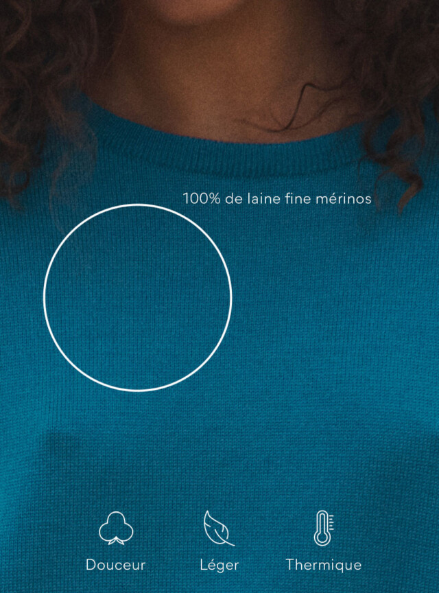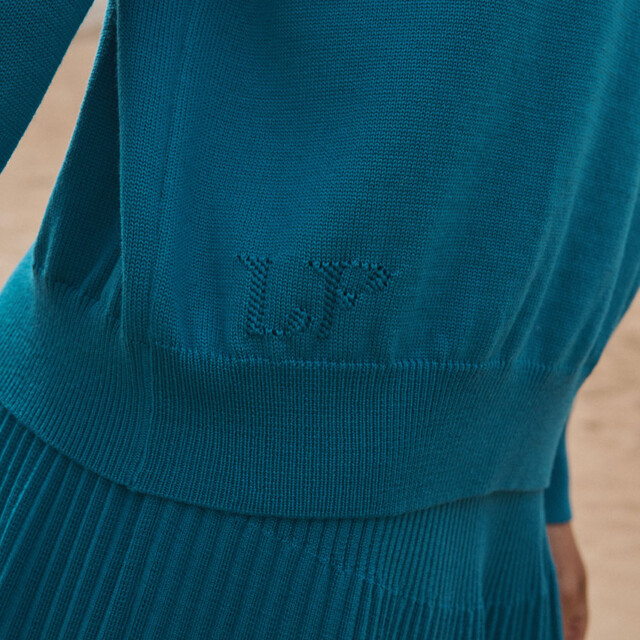 Le pull Agathe en bleu Atlantique séduit par sa profondeur et son éclat raffiné. Confectionné en 100 % laine mérinos avec une coupe loose et une maille jersey souple, il enveloppe avec confort et style. L’encolure ronde en côtes redoublées dévoile le sigle LF ajouré, détail emblématique. Un bleu intense qui dynamise les looks du quotidien sans en faire trop.