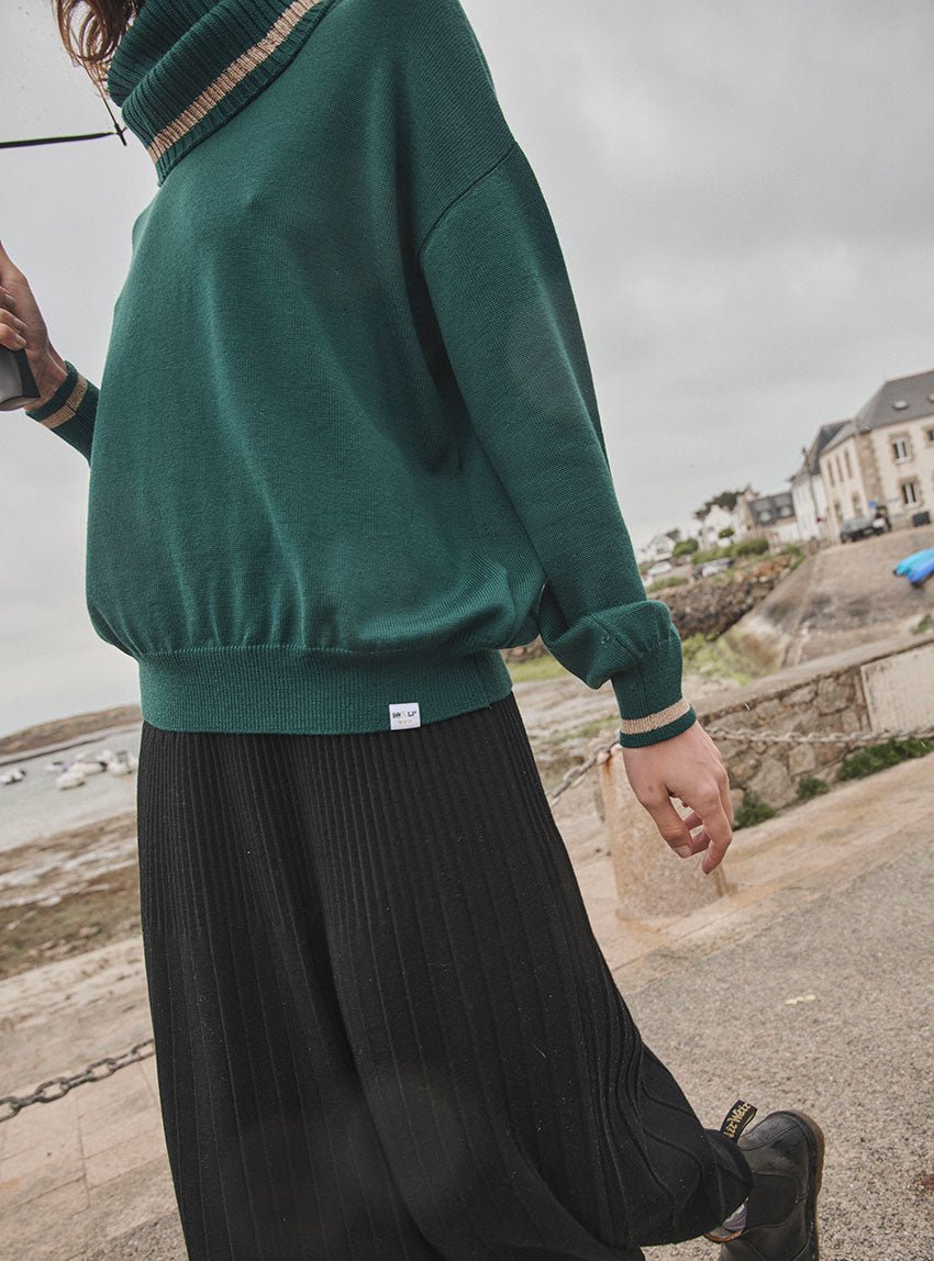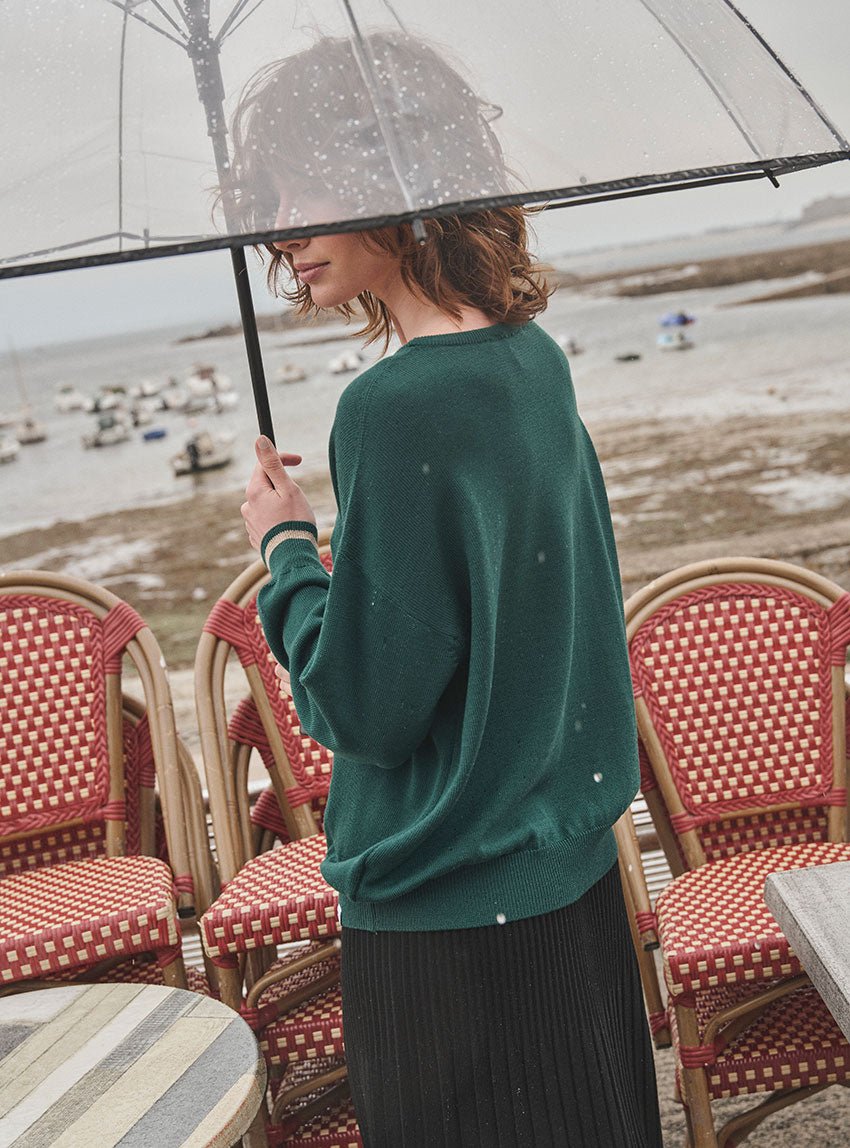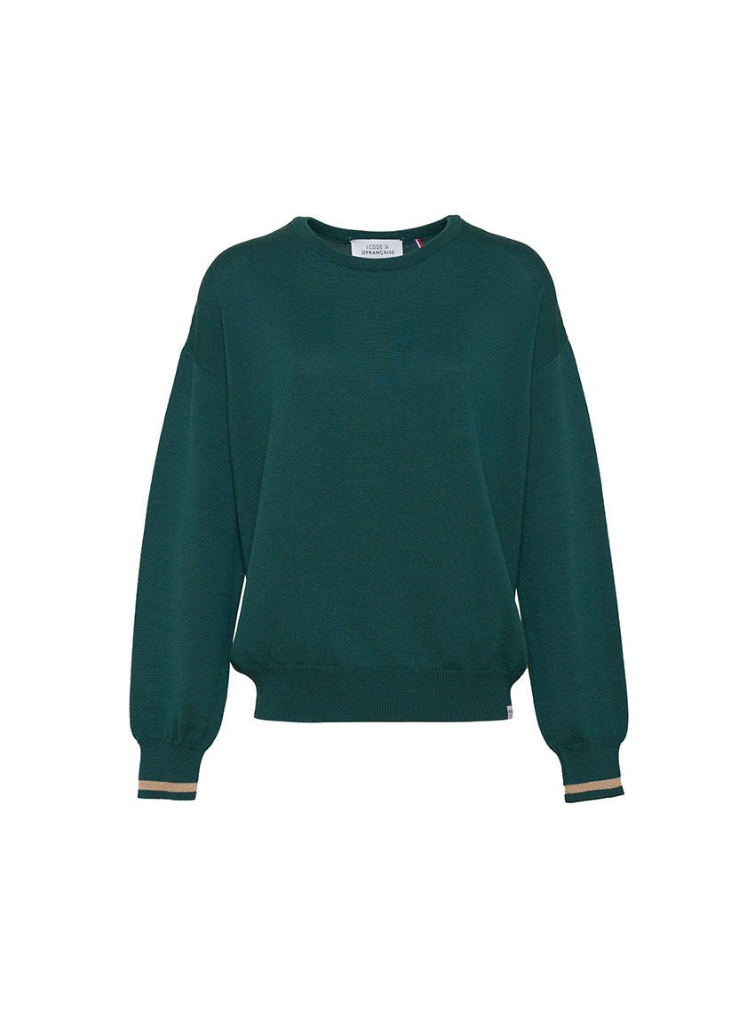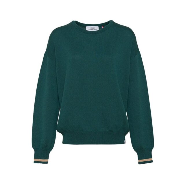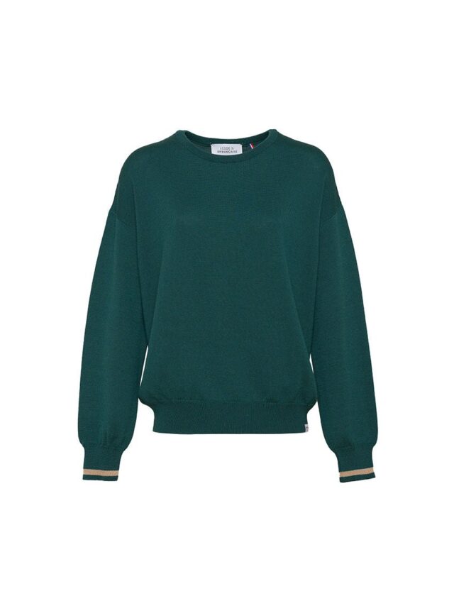 Pull col rond vert en maille jersey, en 100% laine mérinos. Exclusivité issue de la capsule iCode x LAFRANÇAISE. Le pull a une coupe légèrement oversize, si vous voulez le même rendu que sur la photo, prenez la taille au-dessus de votre taille habituelle.