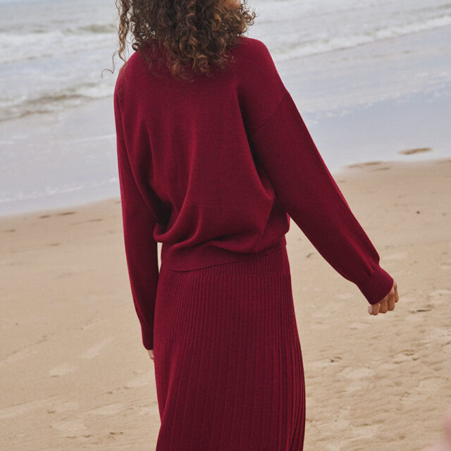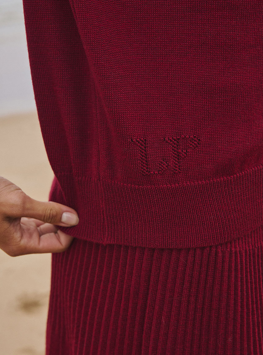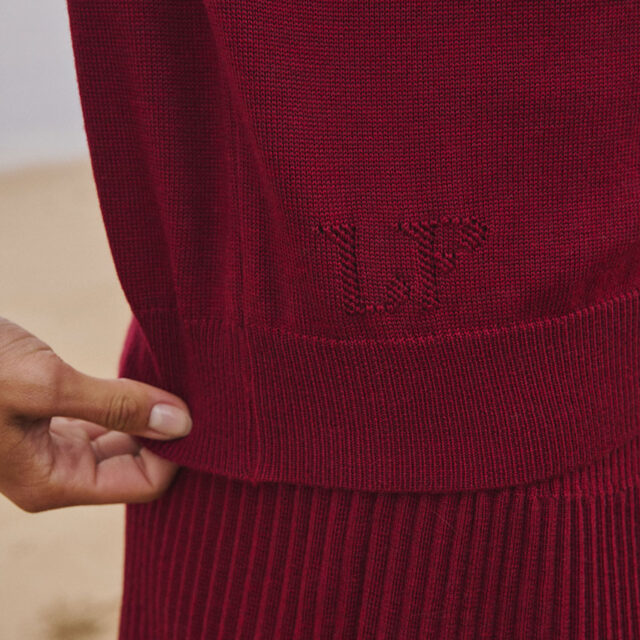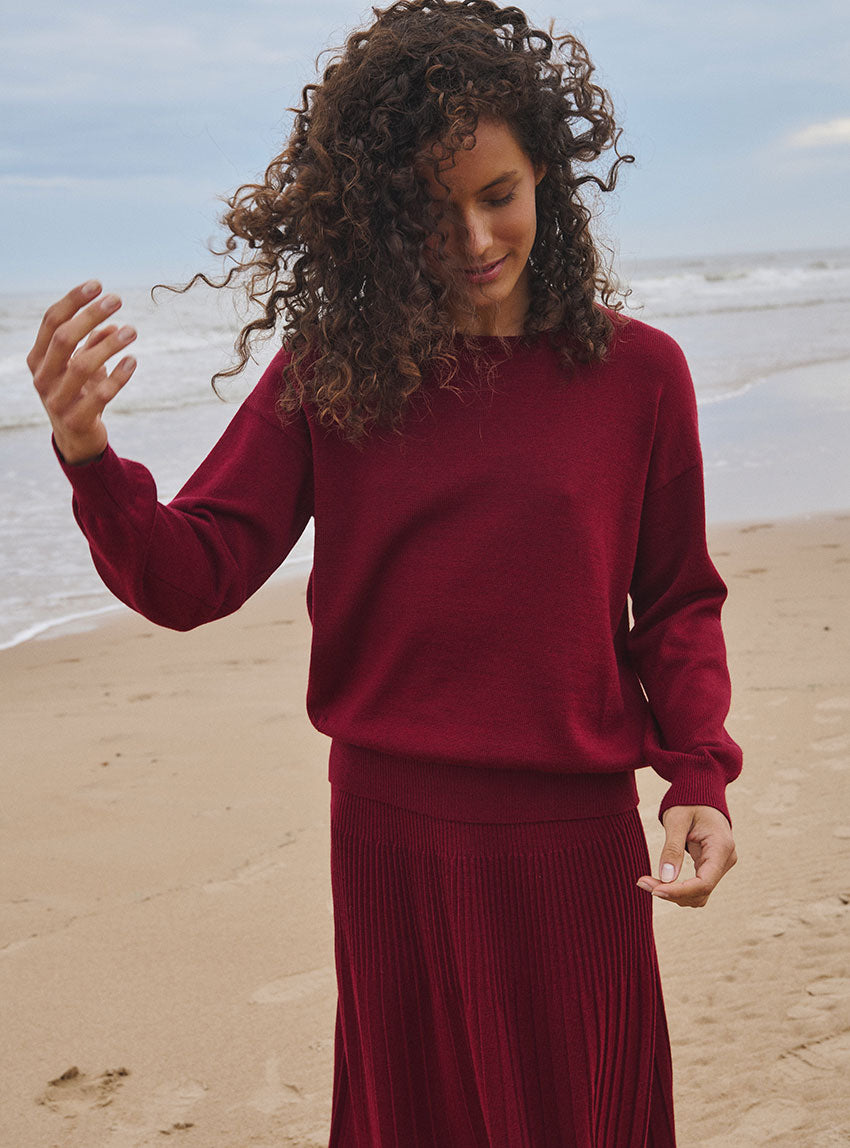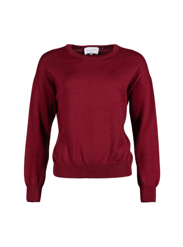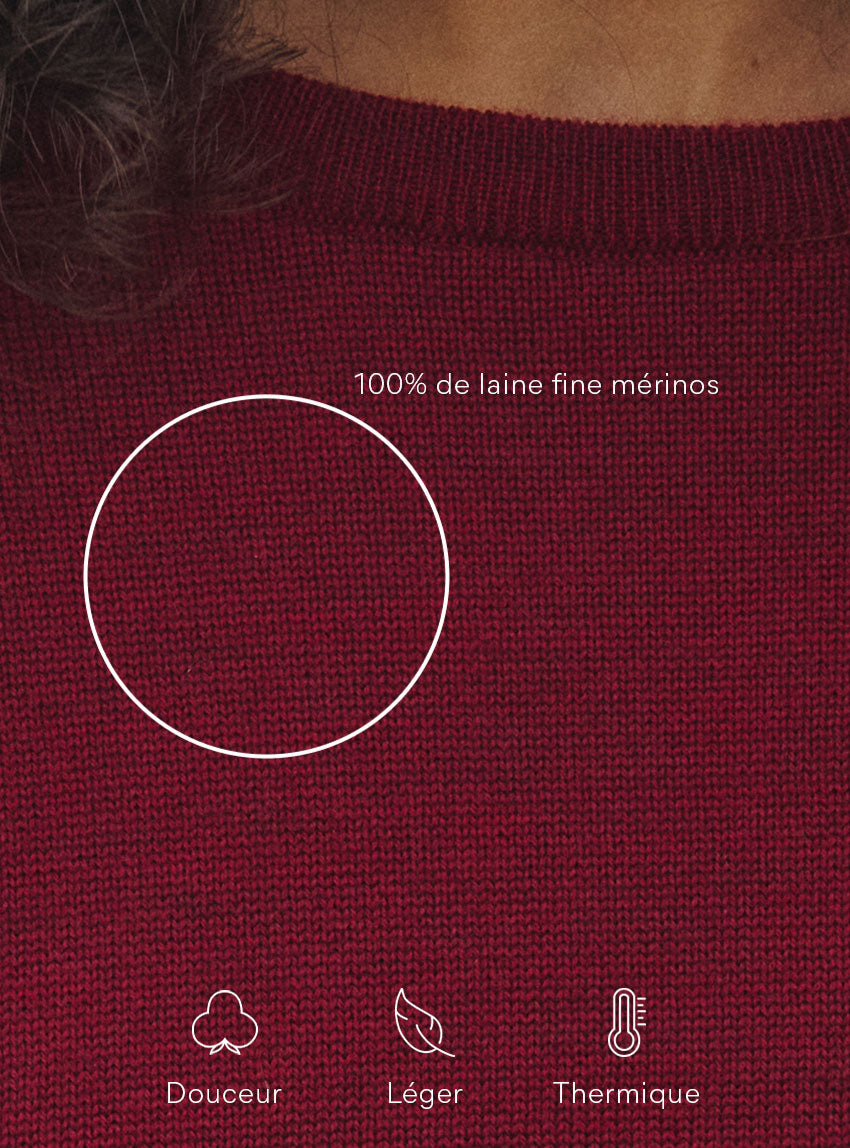 Le pull Agathe en rouge bourgogne affirme un style chaleureux et profond. Tricoté en 100% laine mérinos dans une coupe loose, il allie confort et caractère. Sa maille jersey et son encolure ronde à côtes redoublées laissent apparaître le sigle LF ajouré, touche signature. Un coloris intense qui sublime la silhouette et se marie aussi bien avec un jean brut qu’avec une jupe plus habillée.S'associe parfaitement avec les cols Anaïs.