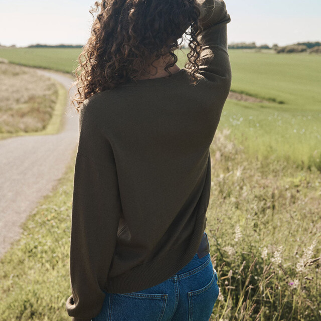 Le pull Aglaé en vert jonc déploie une nuance végétale et apaisante. Tricoté en 100 % laine mérinos avec une coupe loose et une maille jersey souple, il enveloppe de confort tout en gardant une allure moderne. Son col V en côtes redoublées structure le décolleté, et les finitions bords-côtes apportent une touche nette. Une couleur subtile qui se marie aussi bien aux tons neutres qu’aux imprimés.