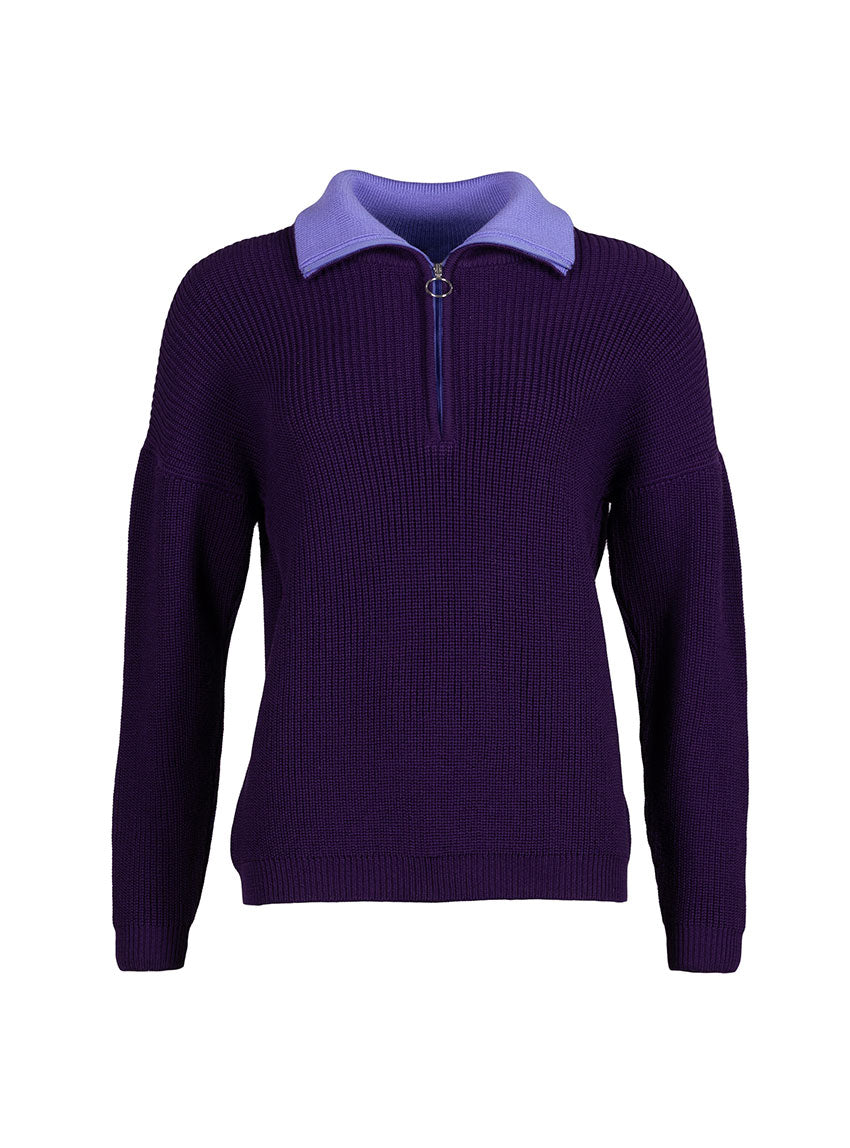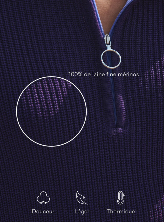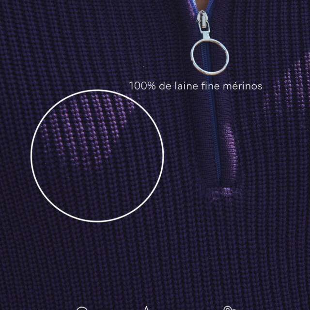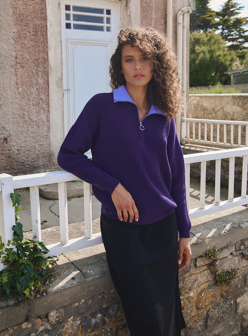 Le pull Agnès violet encrier en laine fine mérinos séduit par sa maille perlée élégante et son col camionneur zippé au contraste violet pop, offrant douceur, chaleur et une touche moderne à vos tenues d’hiver.