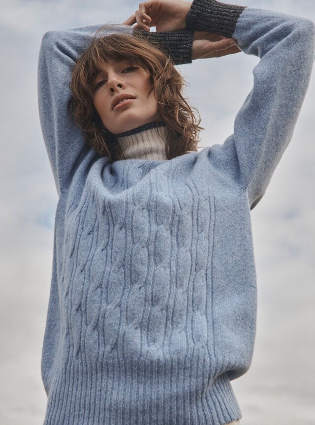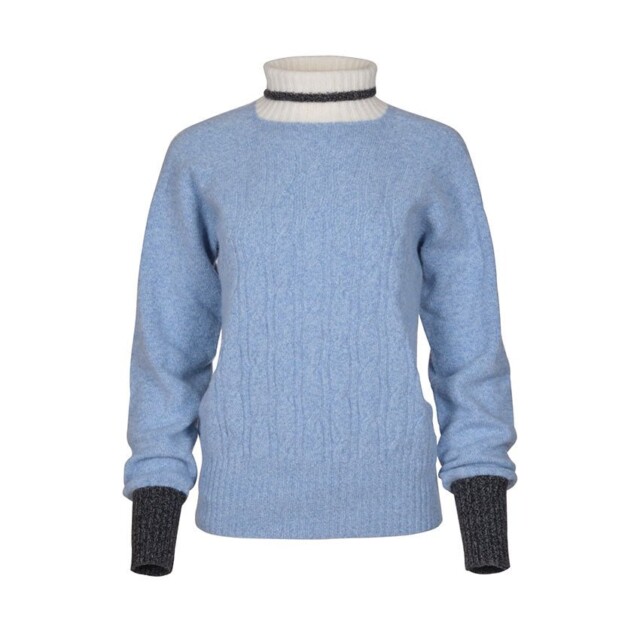 Le pull Anna en bleu mouline séduit par son jeu de contrastes subtils. Tricoté en maille jersey avec torsades et emmanchures raglan, il offre un volume confortable et structuré. Son col montant blanc naturel souligné d’un liseret gris fait écho aux manches gris foncé pour une touche graphique moderne. Un modèle chaud et original, parfait pour affronter l’hiver avec style.